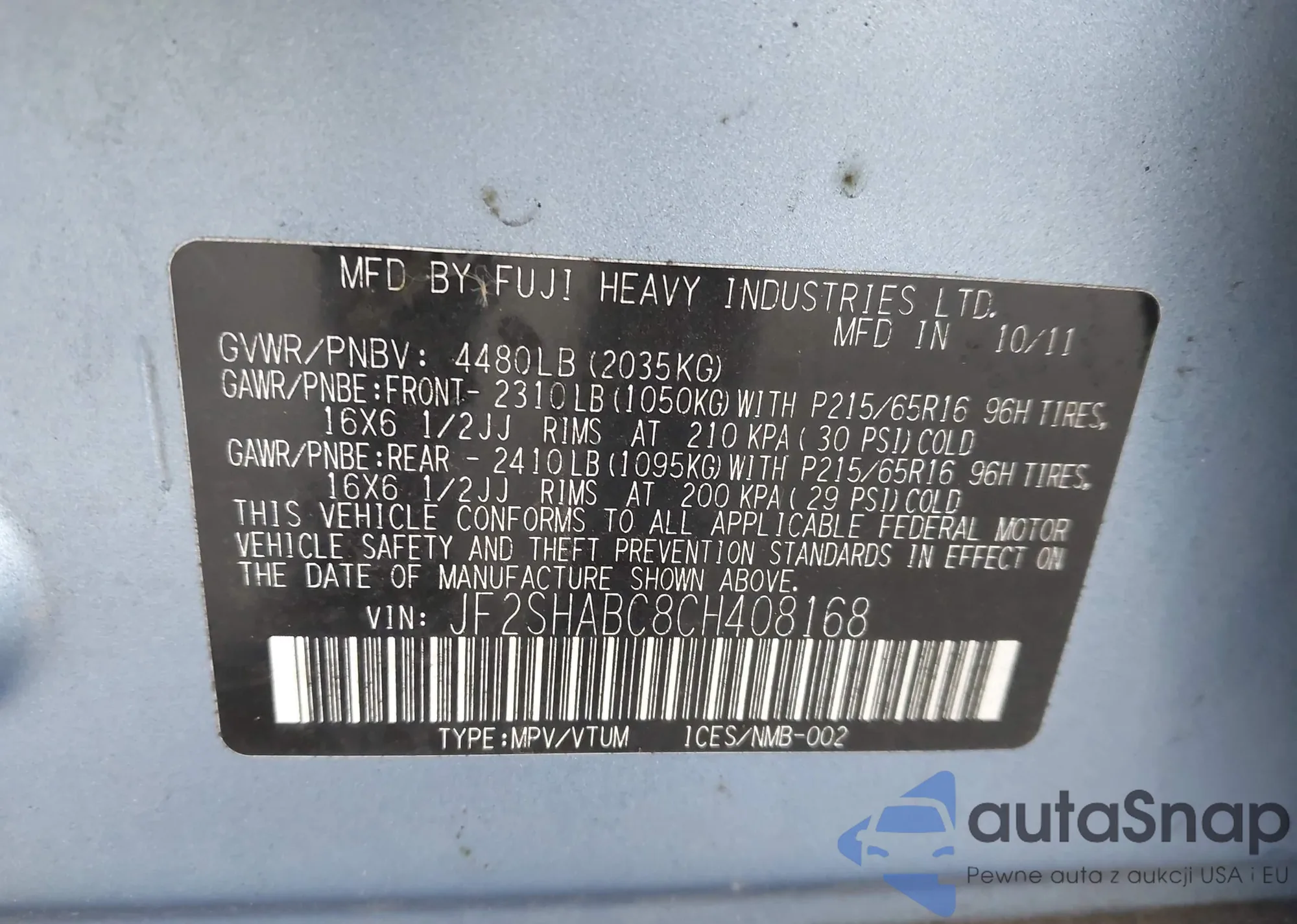 VIN: JF2SHABC8CH408168