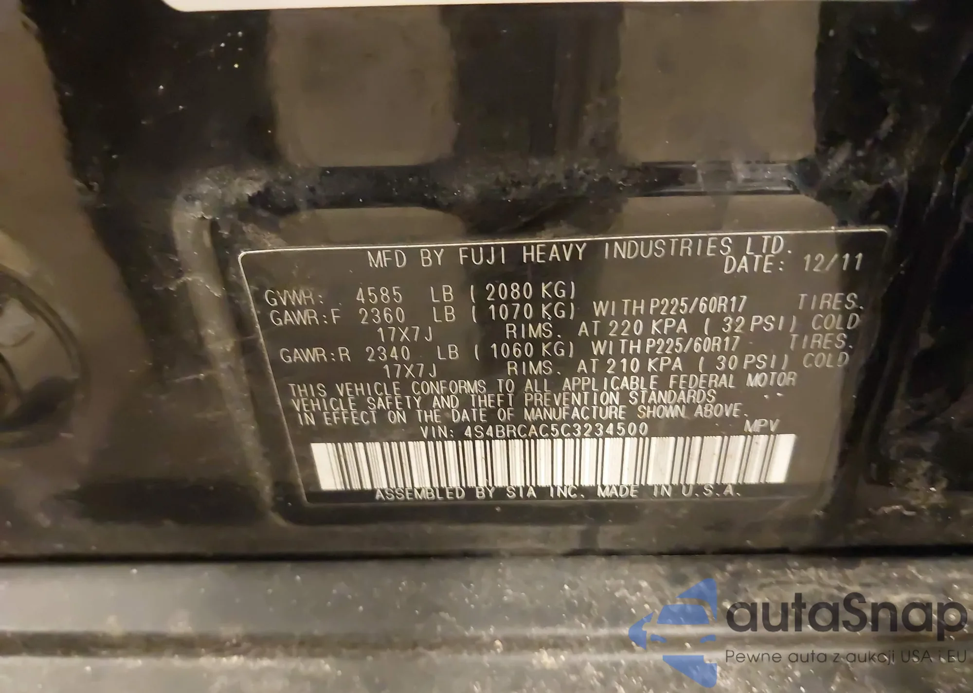 Автомобиль Subaru Outback 2012 (VIN 4S4BRCAC5C3234500) ранее не участвовал в торгах. Документы чистые, пробег соответствует или ниже среднего по рынку. Продаётся страховой компанией — рекомендуем покупку. Доставка в порт займет около 6–8 недель.
