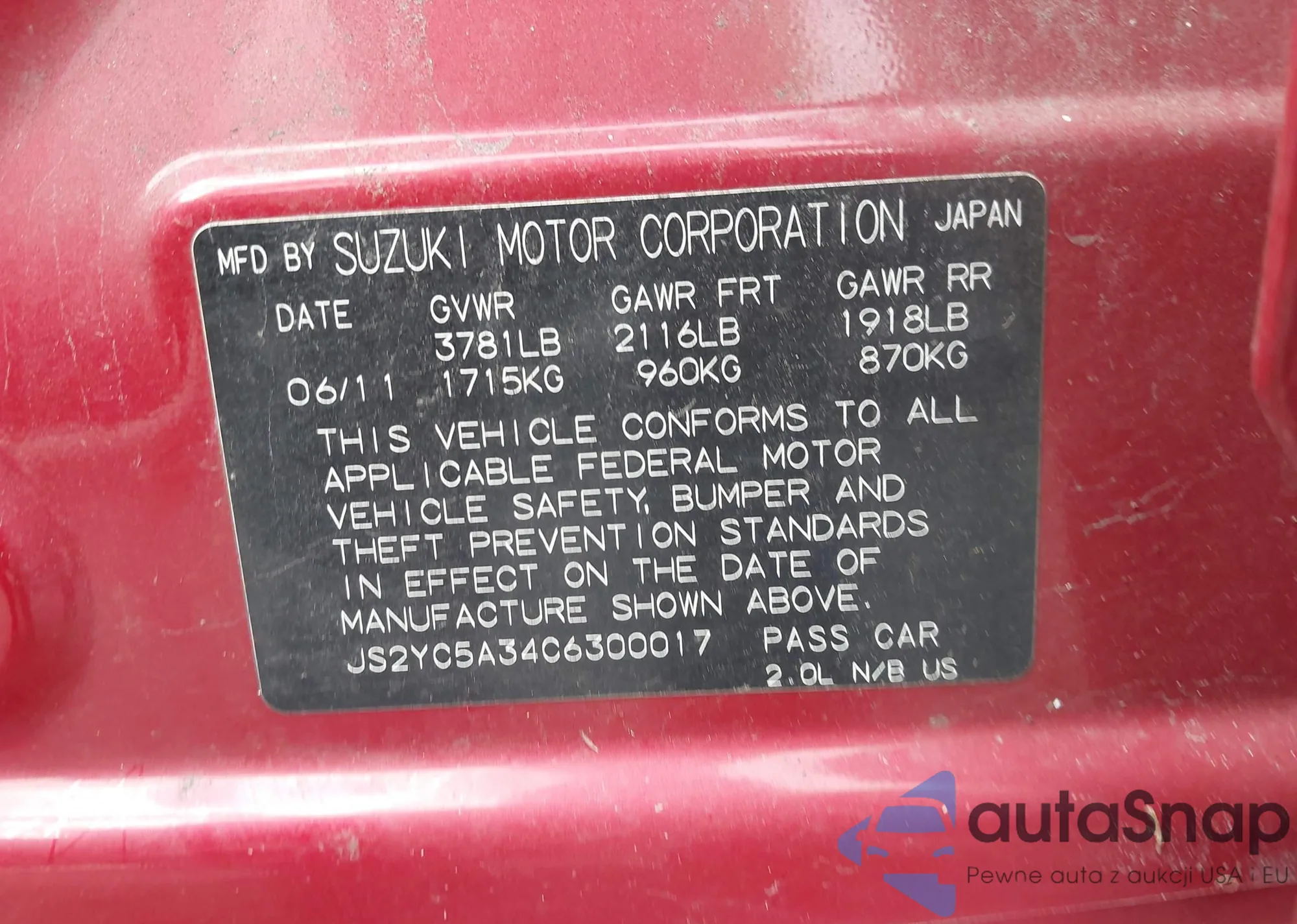 VIN: JS2YC5A34C6300017