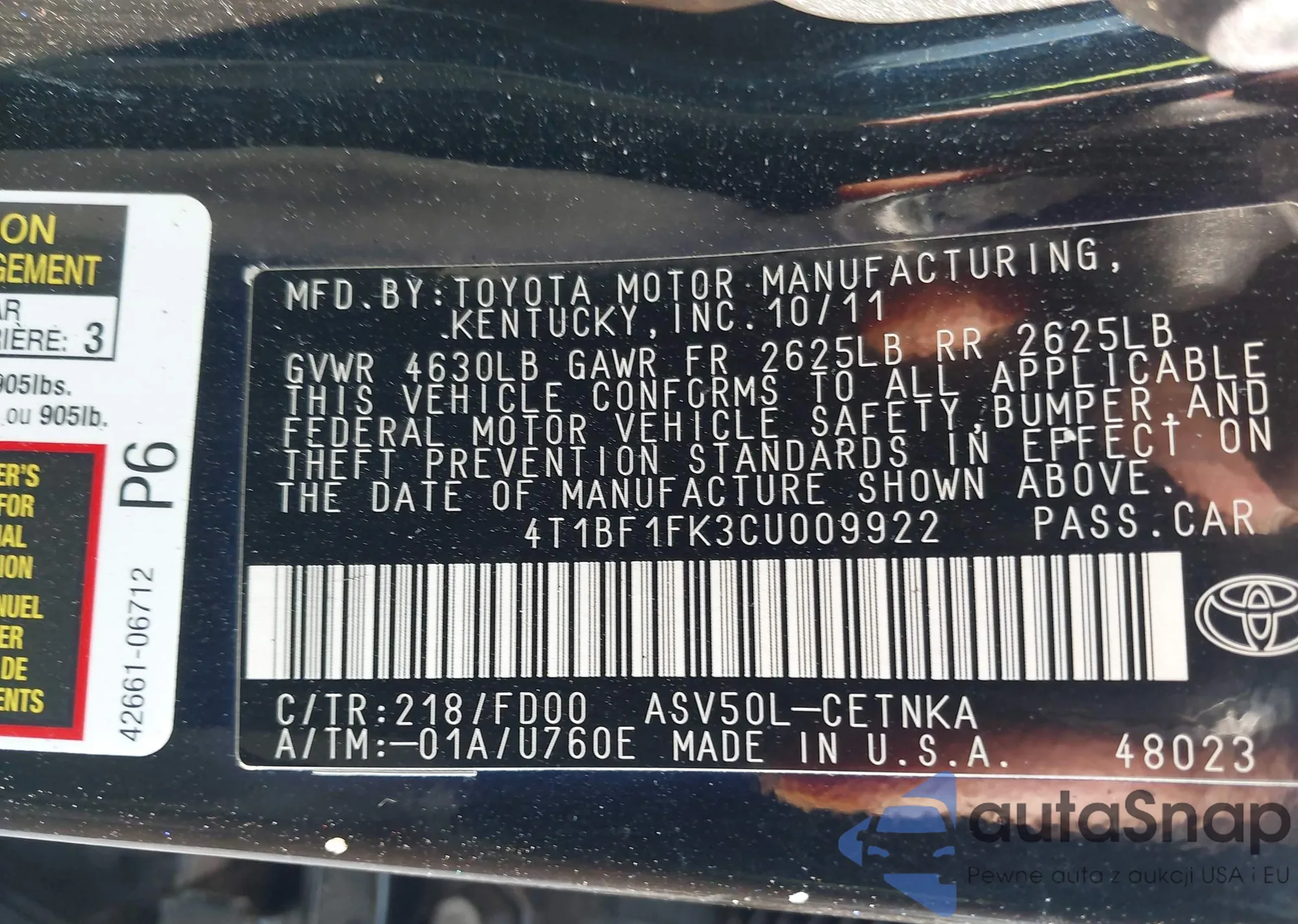 VIN: 4T1BF1FK3CU009922