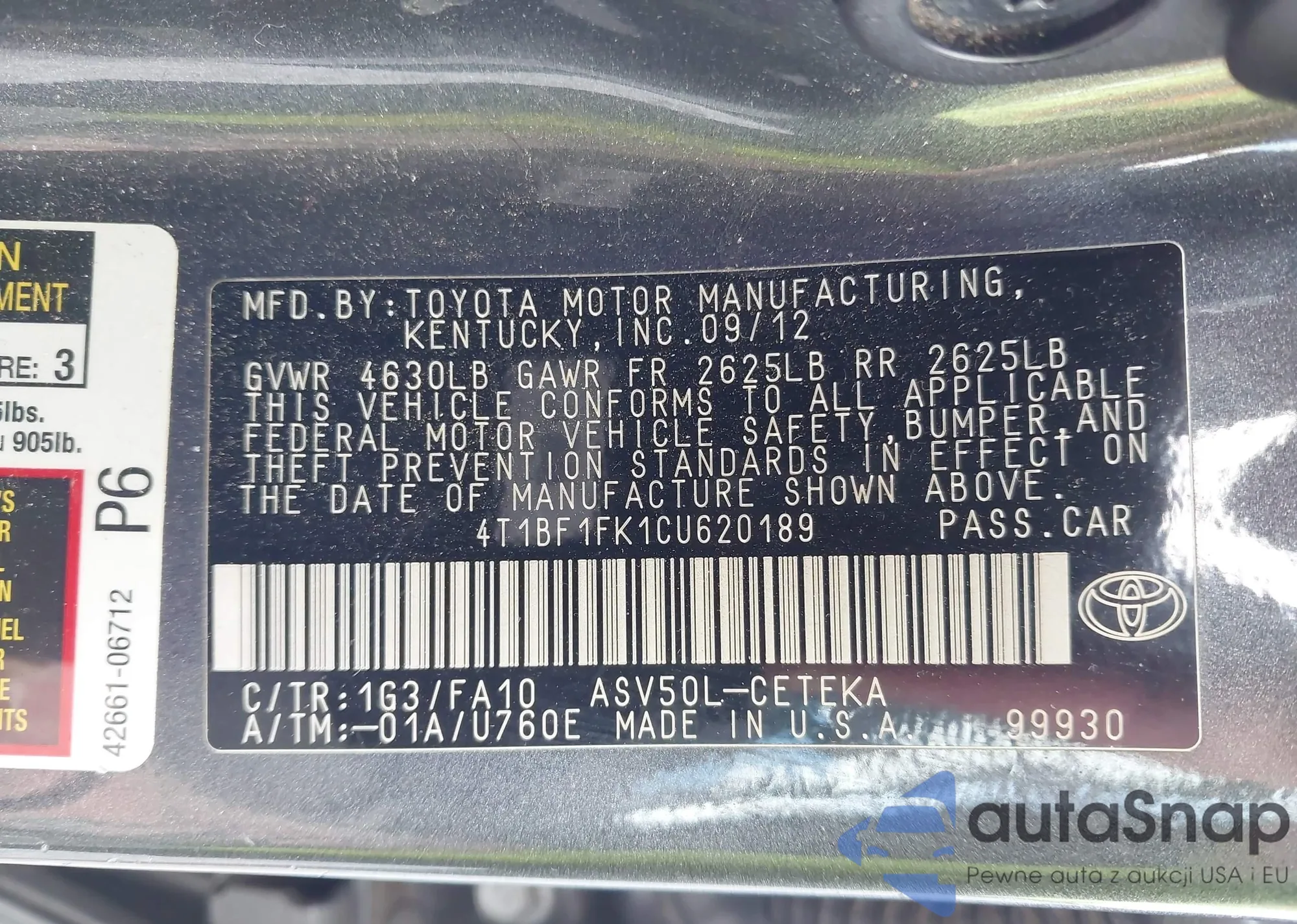VIN: 4T1BF1FK1CU620189