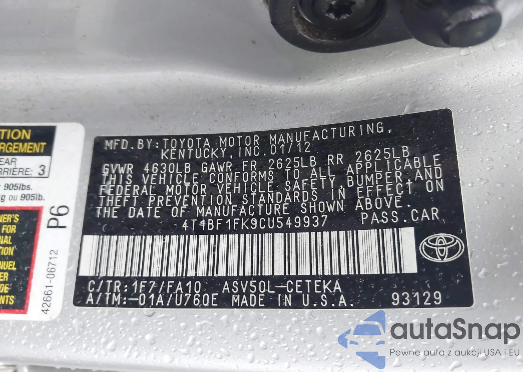 Автомобиль Toyota Camry 2012 (VIN 4T1BF1FK9CU549937) ранее не участвовал в торгах. Документы чистые, пробег соответствует или ниже среднего по рынку. Продаётся страховой компанией — рекомендуем покупку. Доставка в порт займет около 6–8 недель.