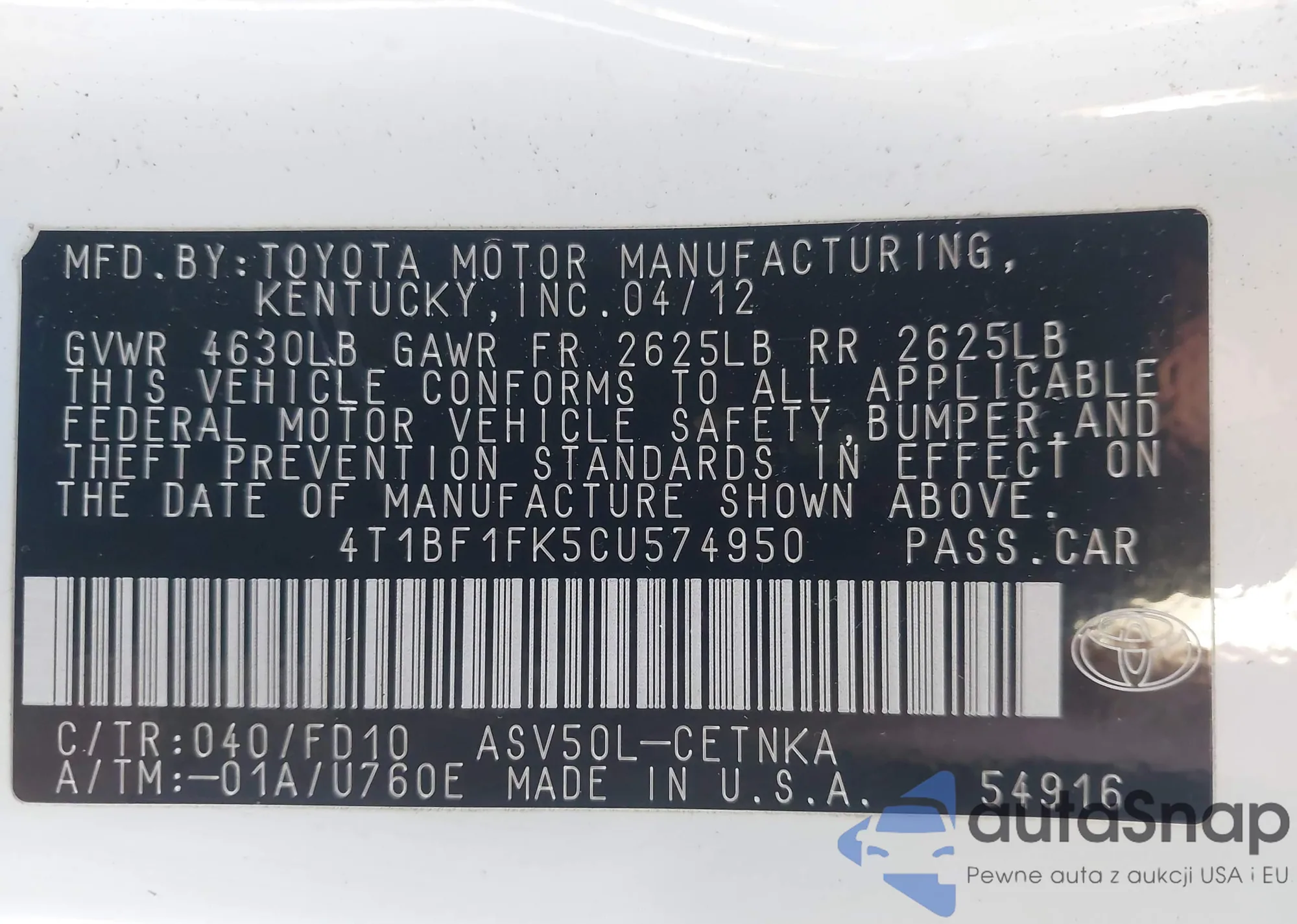 VIN: 4T1BF1FK5CU574950
