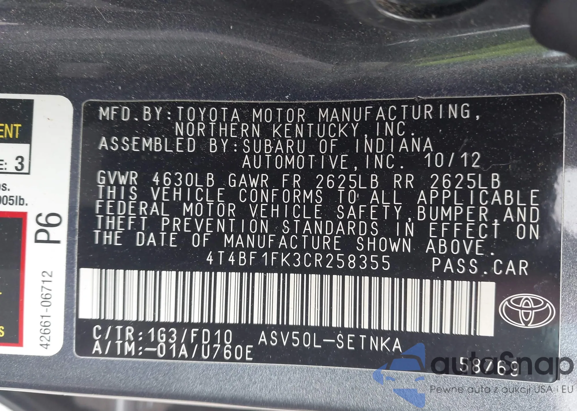 VIN: 4T4BF1FK3CR258355