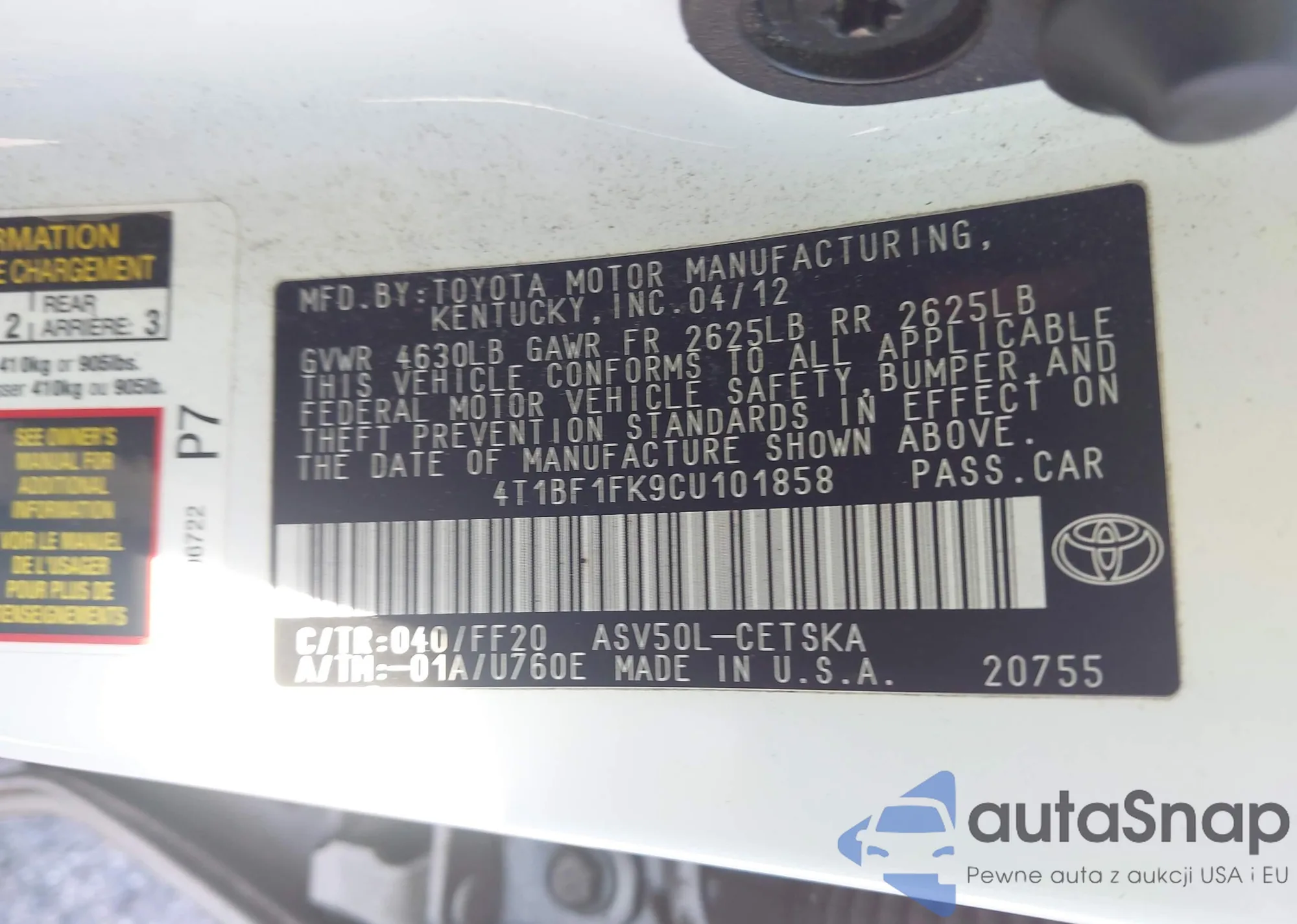 VIN: 4T1BF1FK9CU101858