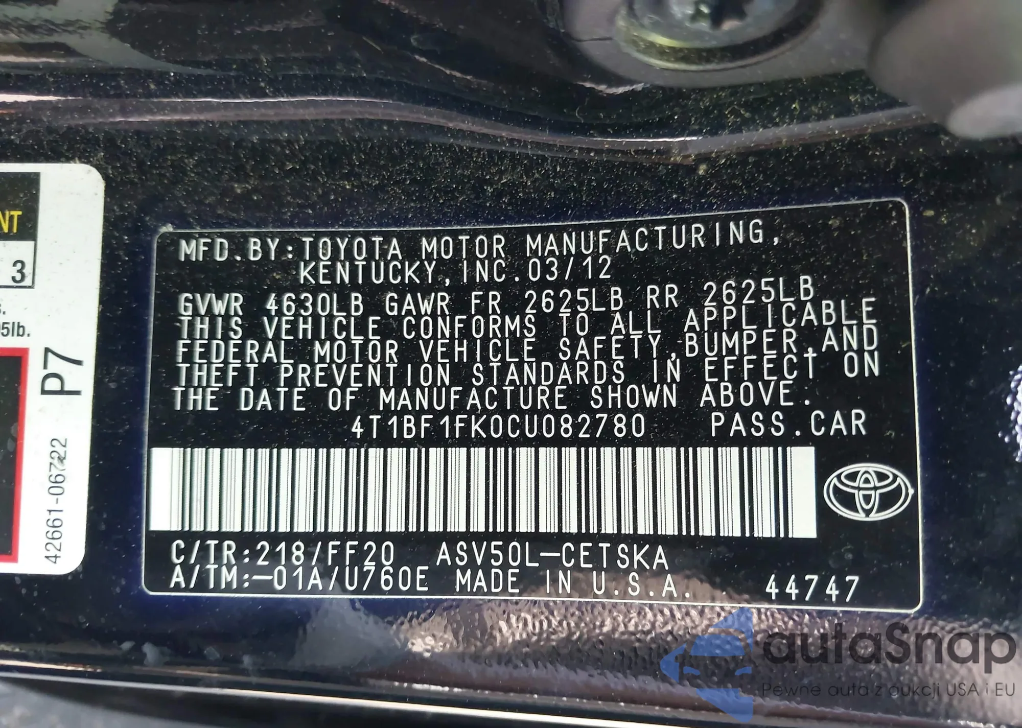 VIN: 4T1BF1FK0CU082780