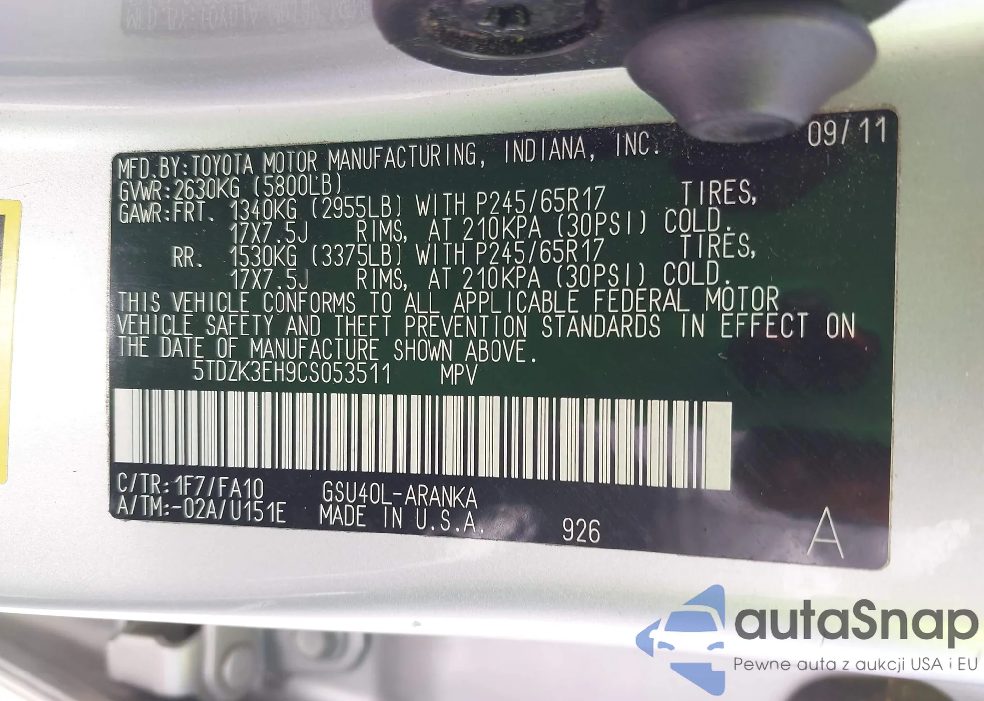VIN: 5TDZK3EH9CS053511