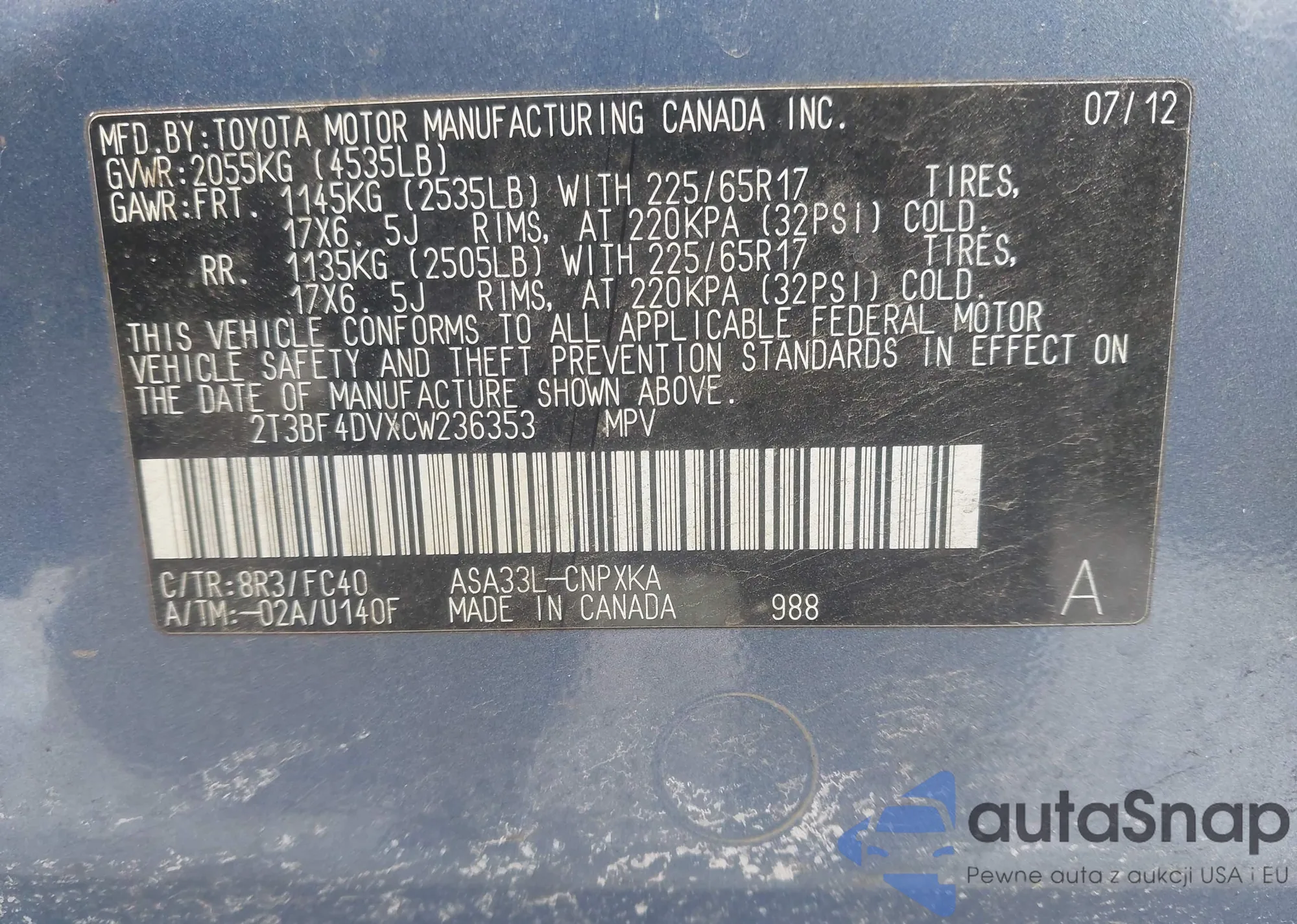 Автомобиль Toyota RAV 4 2012 (VIN 2T3BF4DVXCW236353) ранее не участвовал в торгах. Документы чистые, пробег соответствует или ниже среднего по рынку. Продаётся страховой компанией — рекомендуем покупку. Доставка в порт займет около 6–8 недель.
