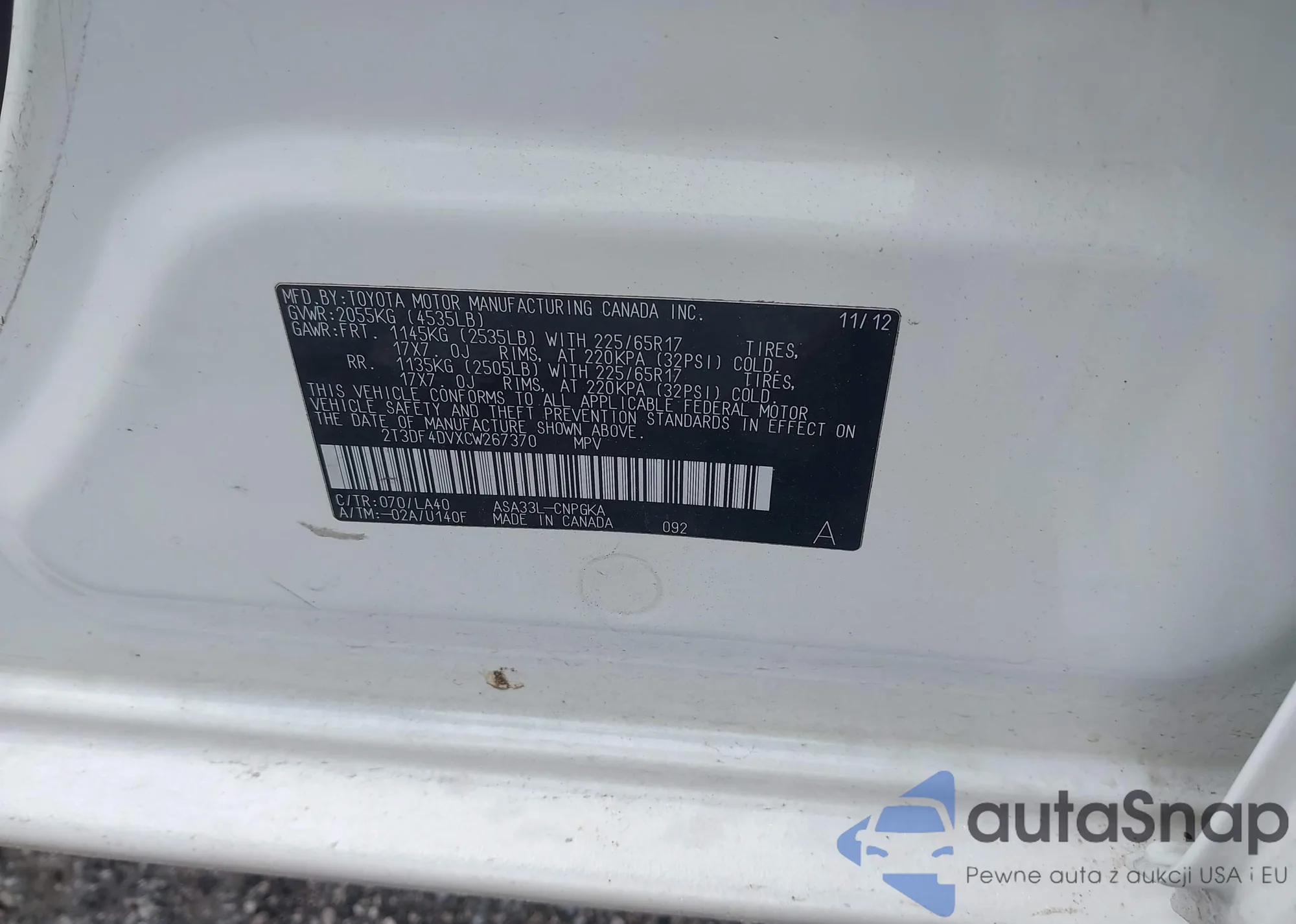VIN: 2T3DF4DVXCW267370