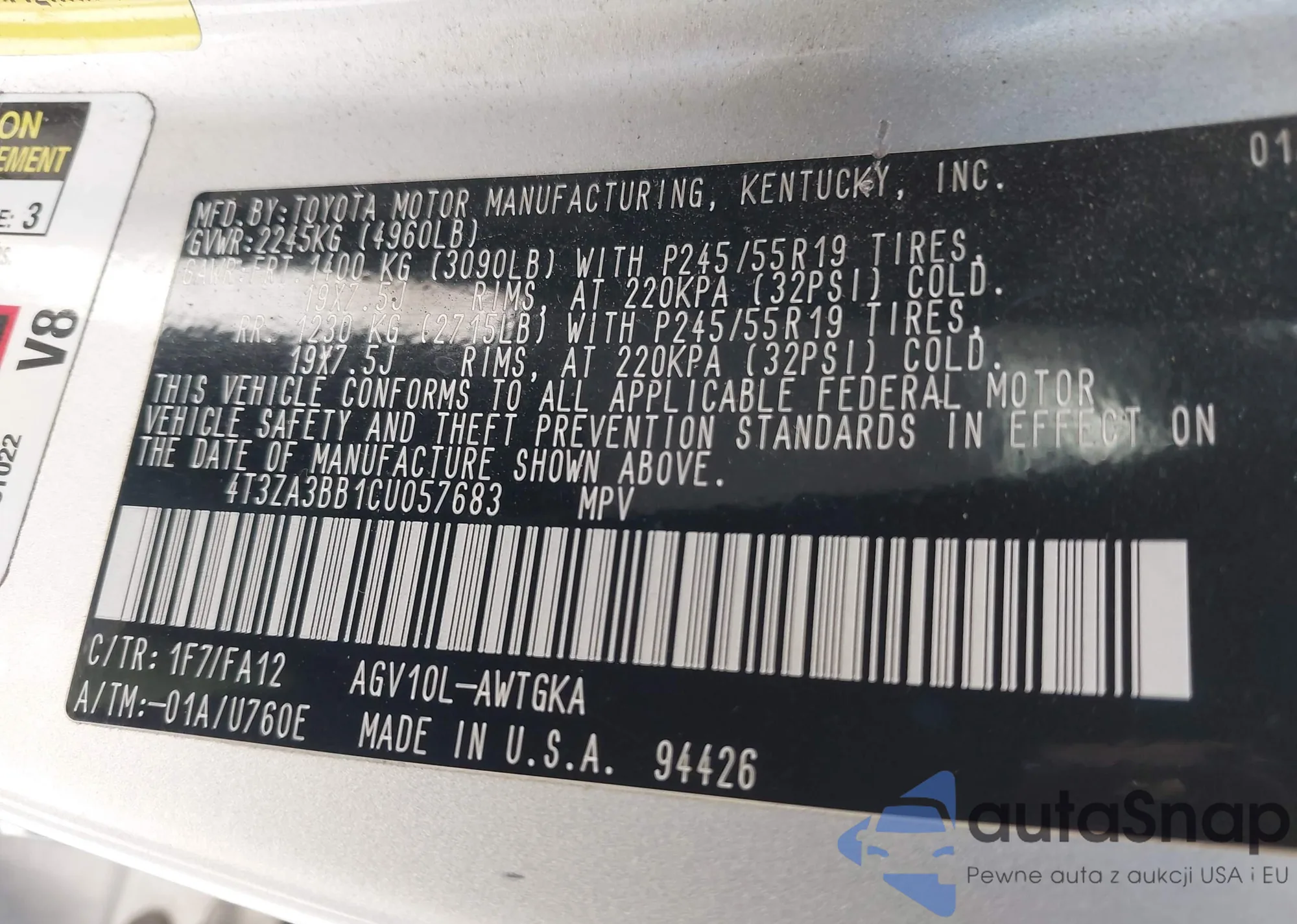 VIN: 4T3ZA3BB1CU057683