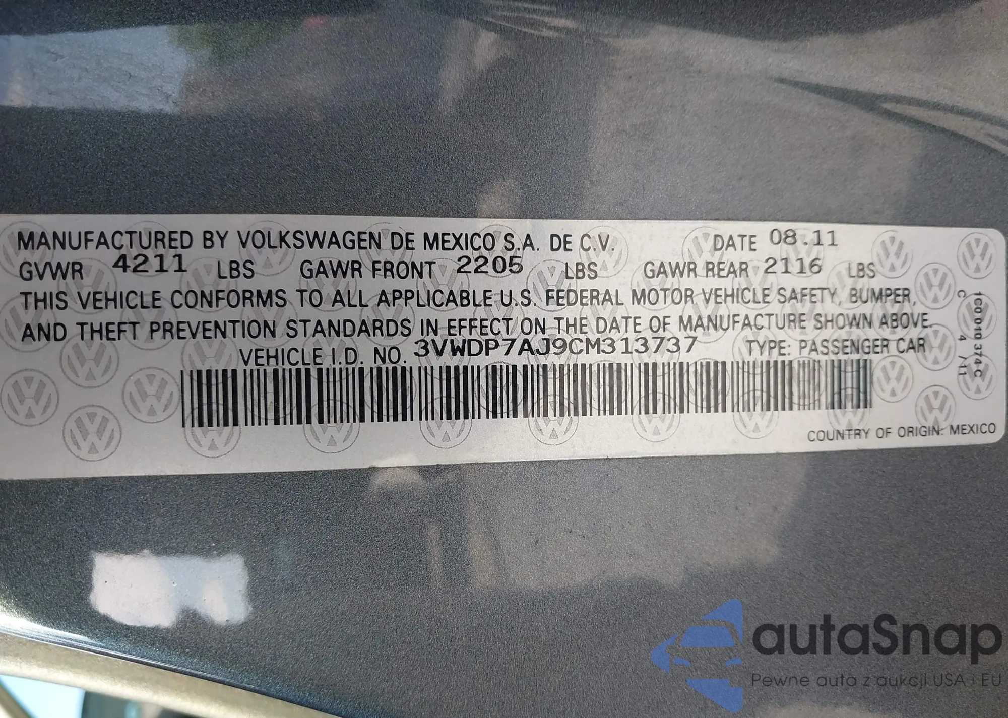 VIN: 3VWDP7AJ9CM313737