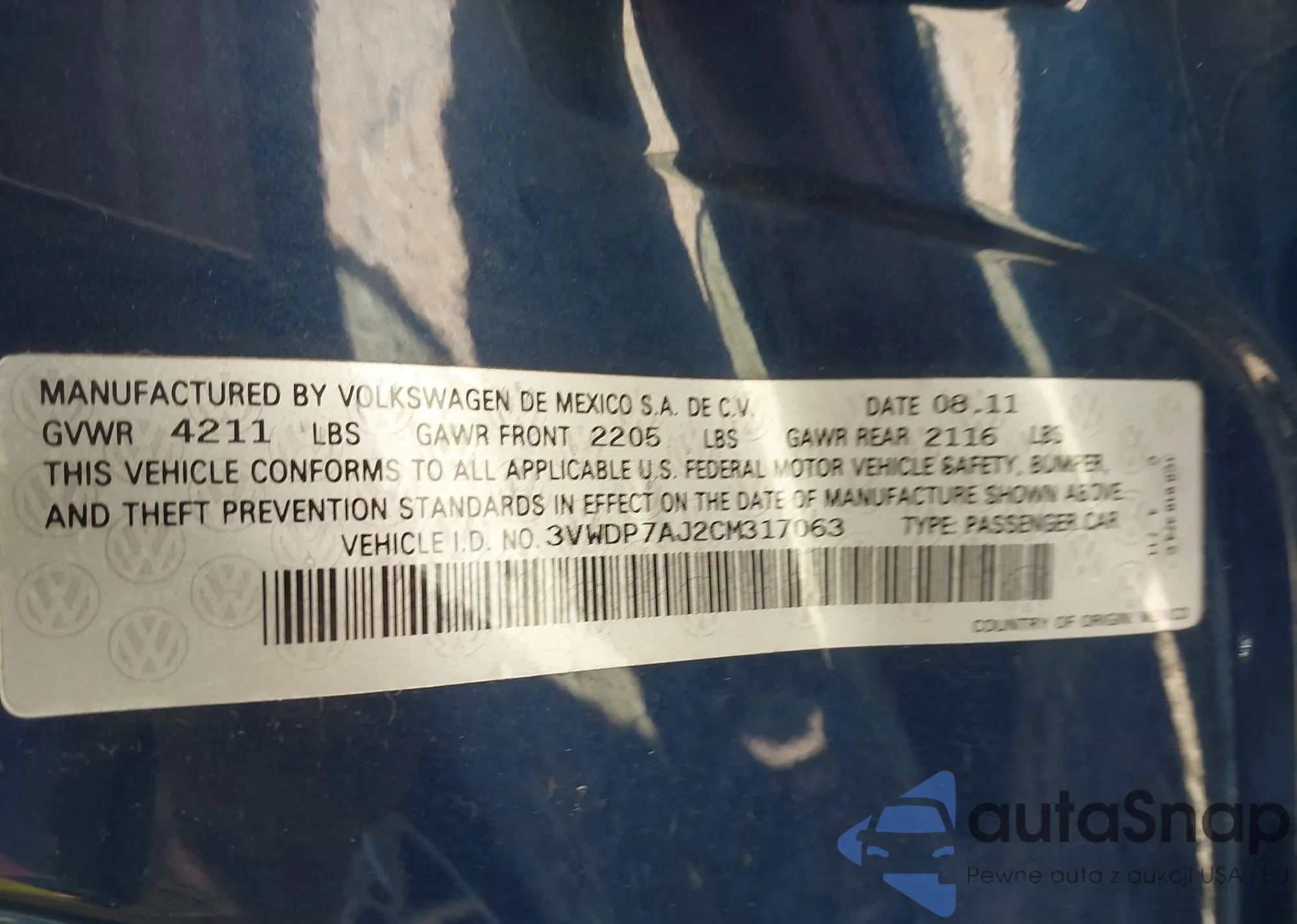 VIN: 3VWDP7AJ2CM317063