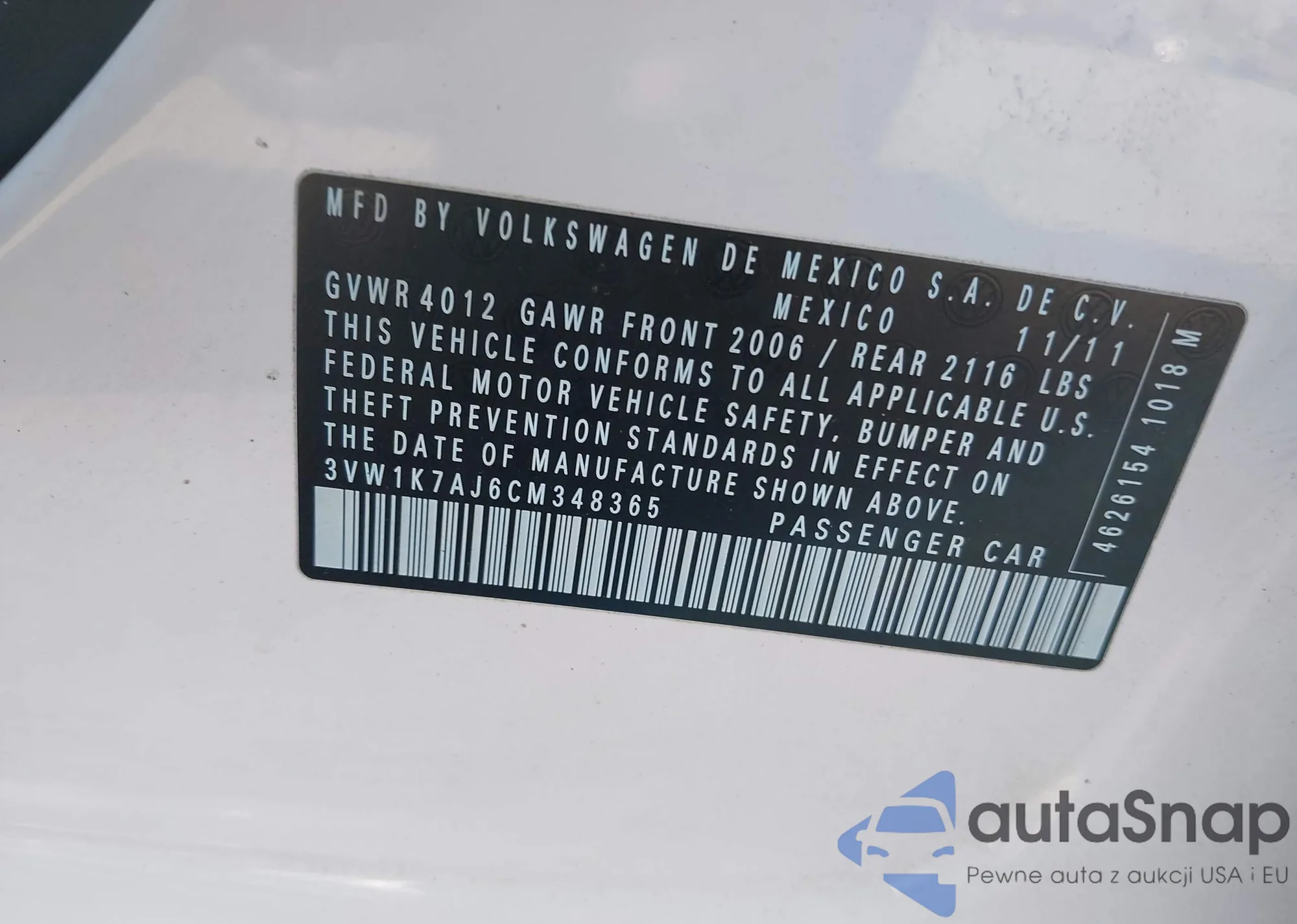 VIN: 3VW1K7AJ6CM348365