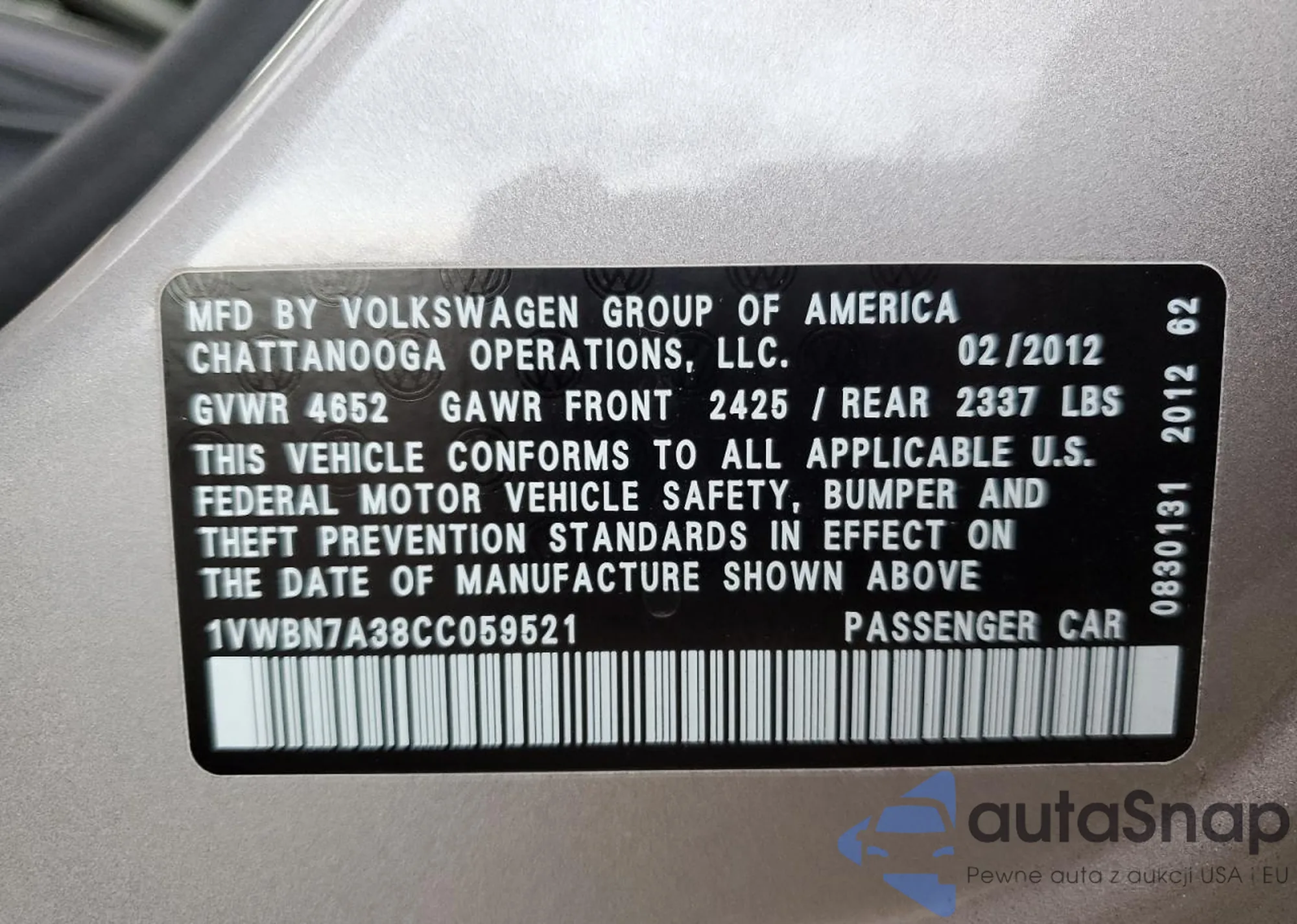 VIN: 1VWBN7A38CC059521