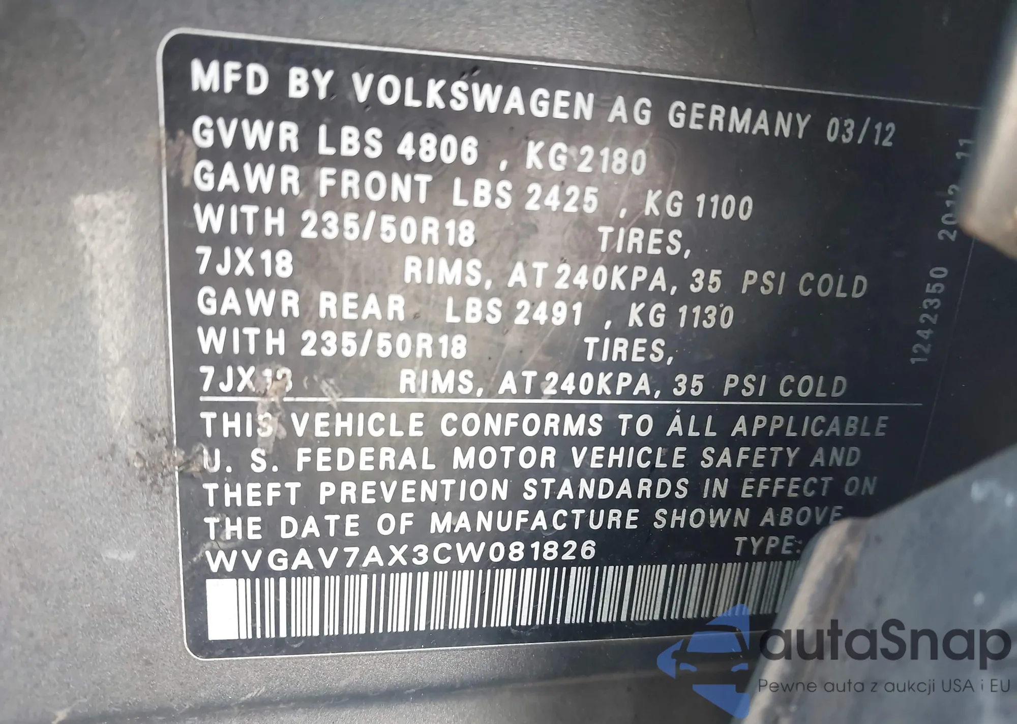 VIN: WVGAV7AX3CW081826