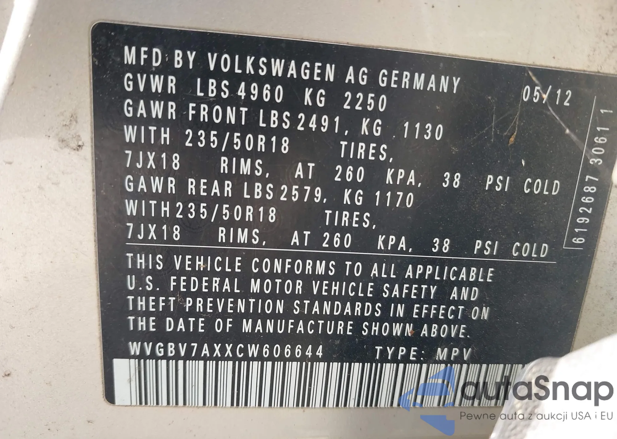 Автомобиль Volkswagen Tiguan 2012 (VIN WVGBV7AXXCW606644) имеет документы, препятствующие регистрации. Могут возникнуть сложности при экспорте и регистрации. Обратитесь к экспертам AutaSnap для поиска альтернатив.