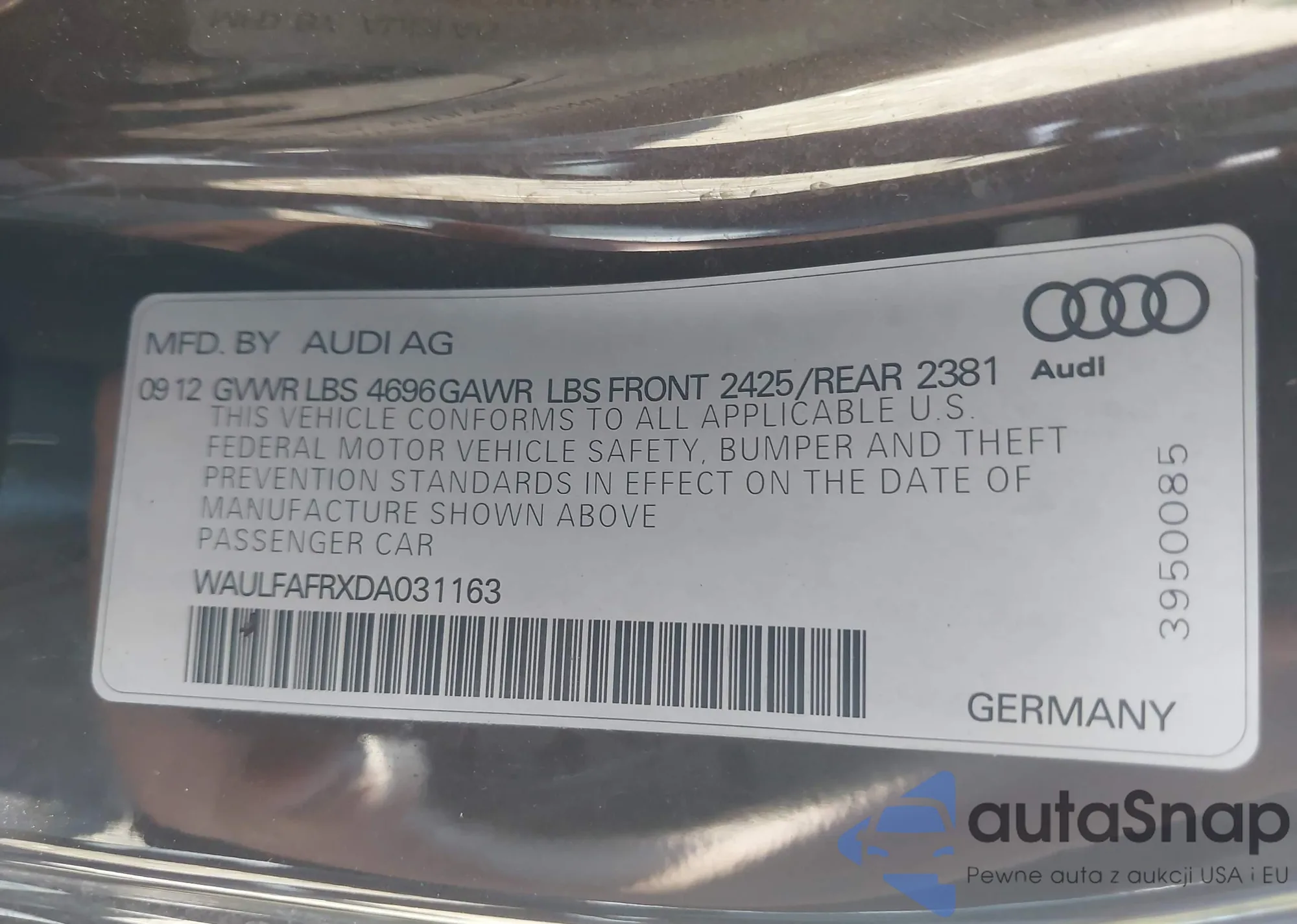 Автомобиль Audi A5 2013 (VIN WAULFAFRXDA031163) имеет документы, препятствующие регистрации. Могут возникнуть сложности при экспорте и регистрации. Обратитесь к экспертам AutaSnap для поиска альтернатив.