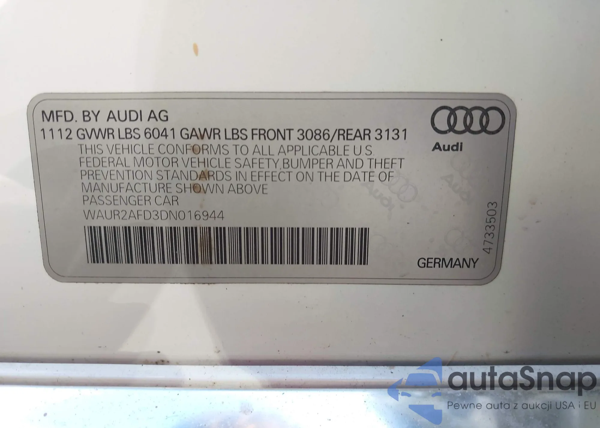 Автомобиль Audi A8 2013 (VIN WAUR2AFD3DN016944) ранее не участвовал в торгах. Документы чистые, пробег соответствует или ниже среднего по рынку. Продаётся страховой компанией — рекомендуем покупку. Доставка в порт займет около 6–8 недель.