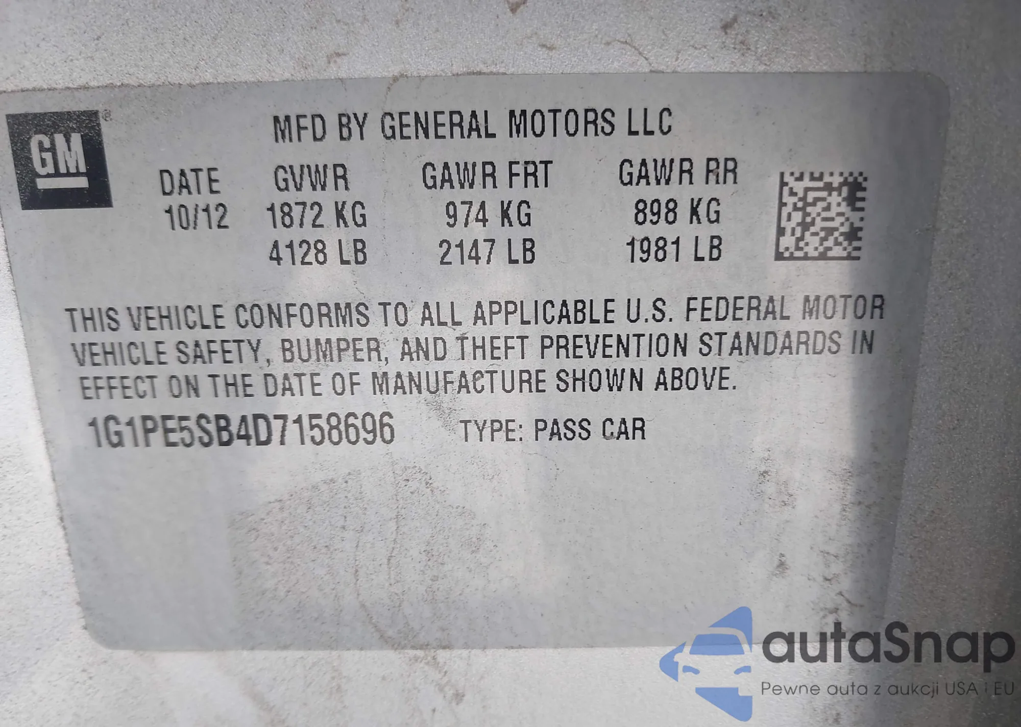 Автомобиль Chevrolet Cruze 2013 (VIN 1G1PE5SB4D7158696) имеет документы, препятствующие регистрации. Могут возникнуть сложности при экспорте и регистрации. Обратитесь к экспертам AutaSnap для поиска альтернатив.