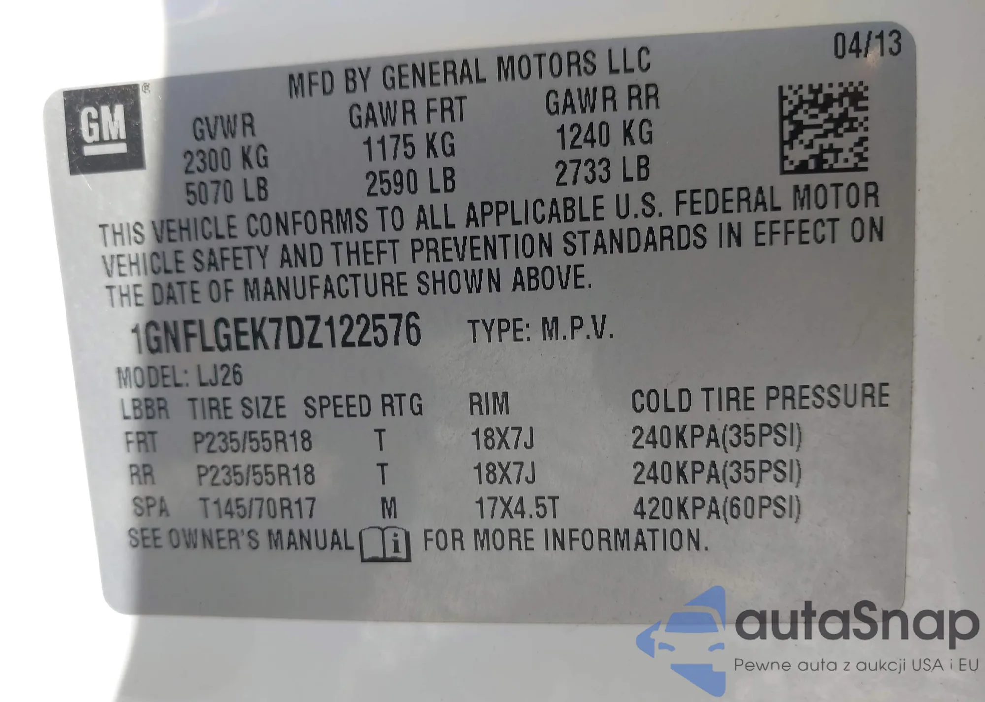 VIN: 1GNFLGEK7DZ122576