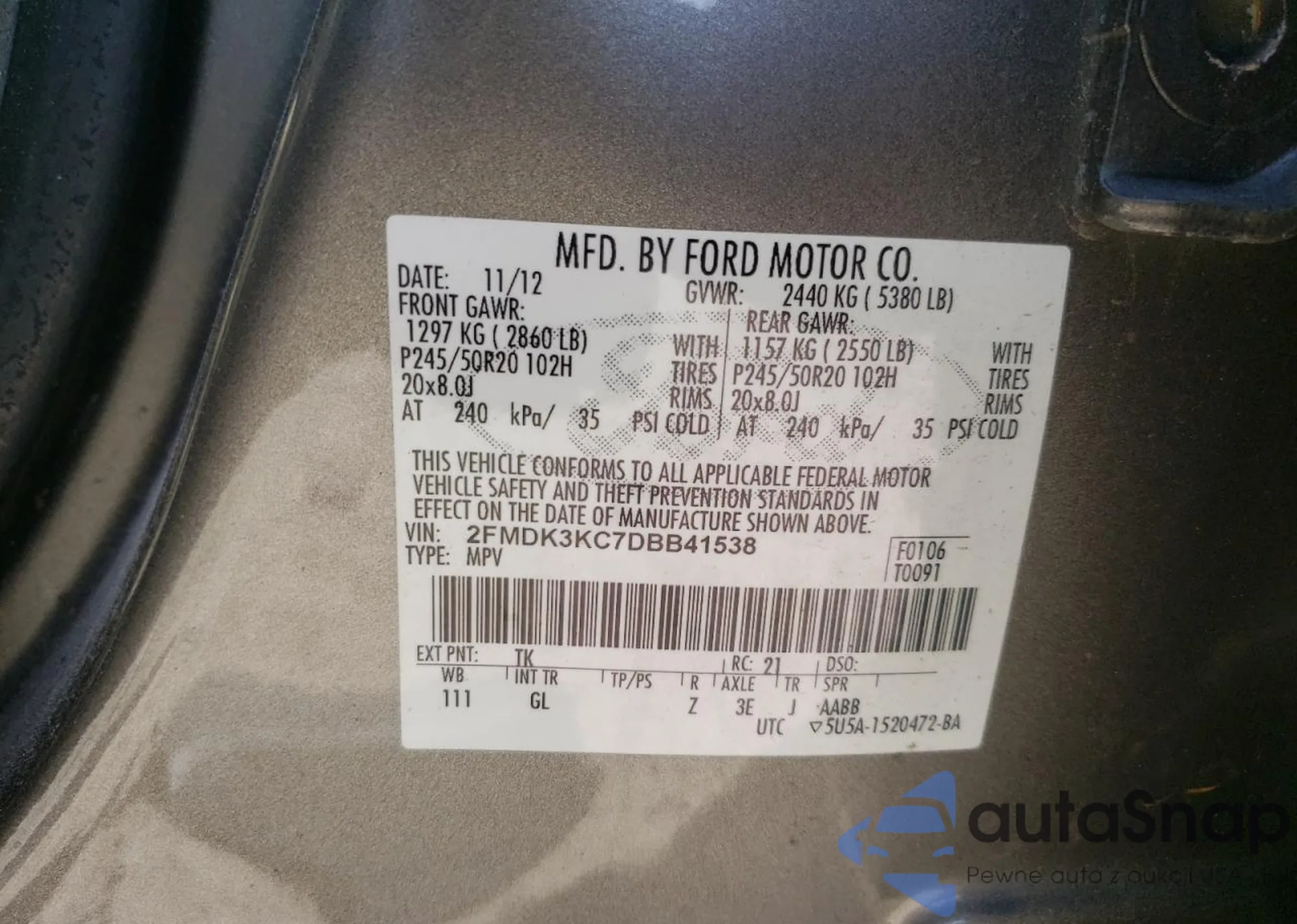 VIN: 2FMDK3KC7DBB41538