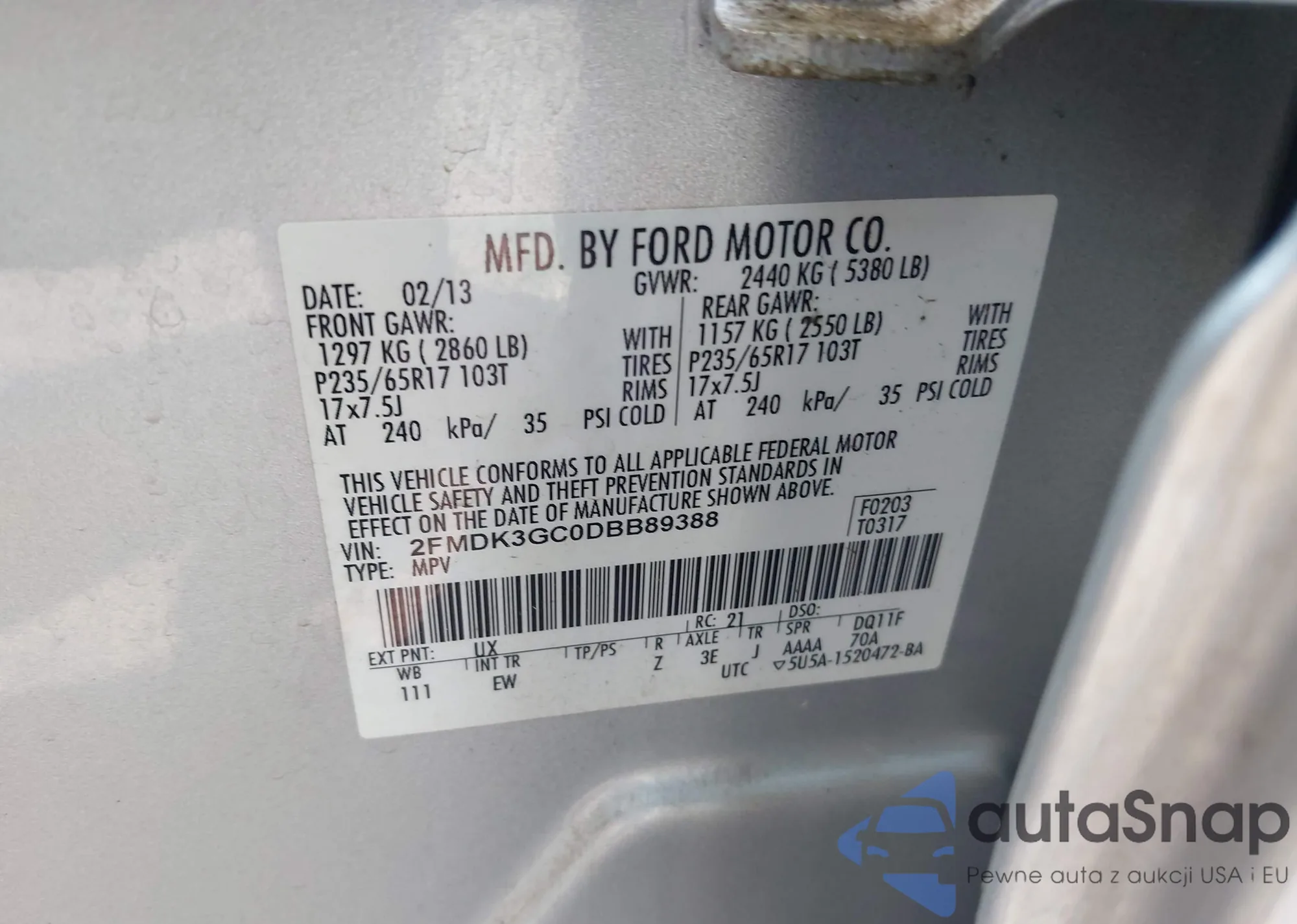 VIN: 2FMDK3GC0DBB89388