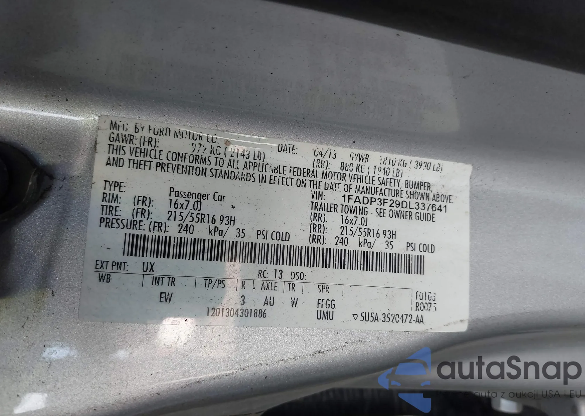 VIN: 1FADP3F29DL337641