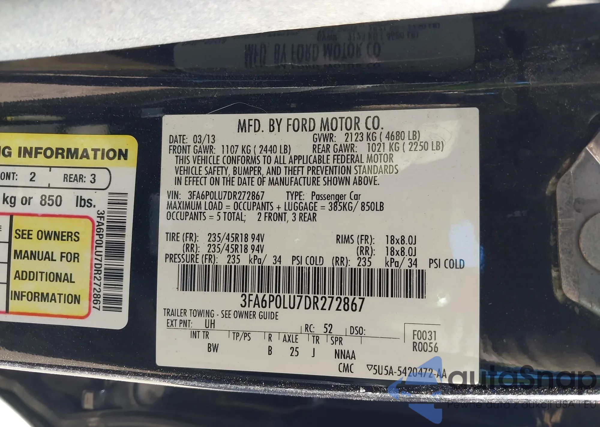 Автомобиль Ford Fusion 2013 (VIN 3FA6P0LU7DR272867) ранее не участвовал в торгах. Документы чистые, пробег соответствует или ниже среднего по рынку. Продаётся страховой компанией — рекомендуем покупку. Доставка в порт займет около 6–8 недель.