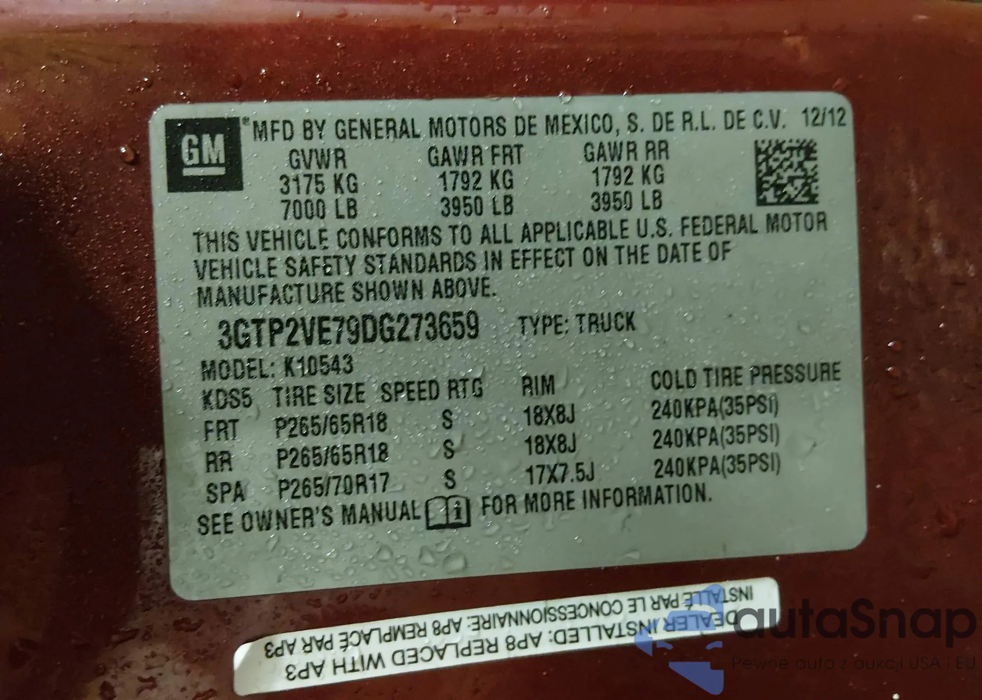 VIN: 3GTP2VE79DG273659