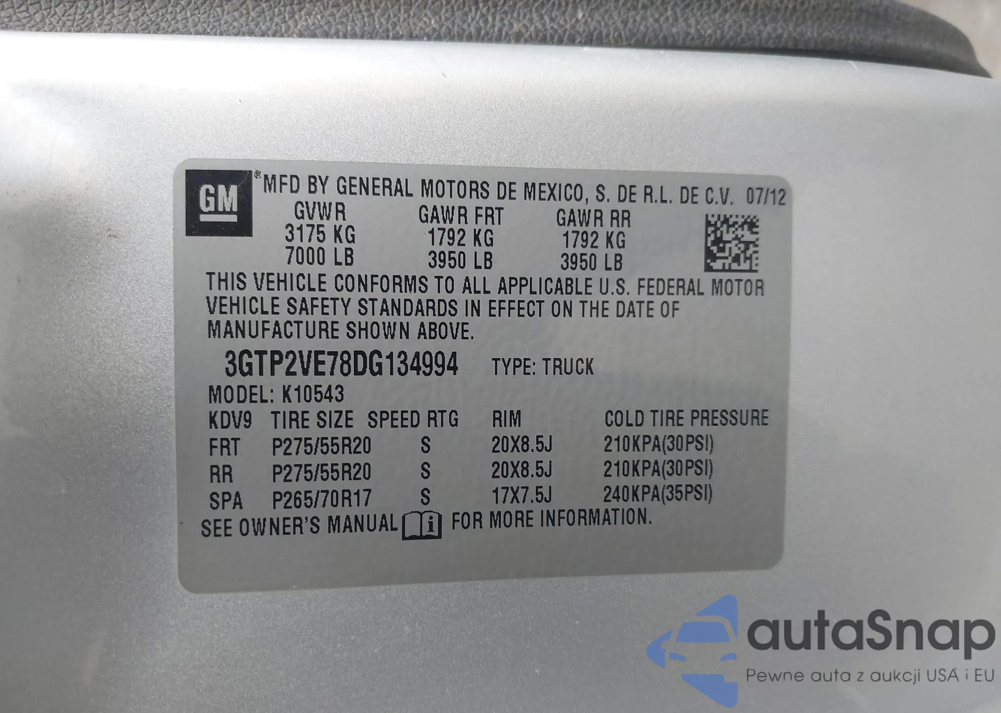 VIN: 3GTP2VE78DG134994