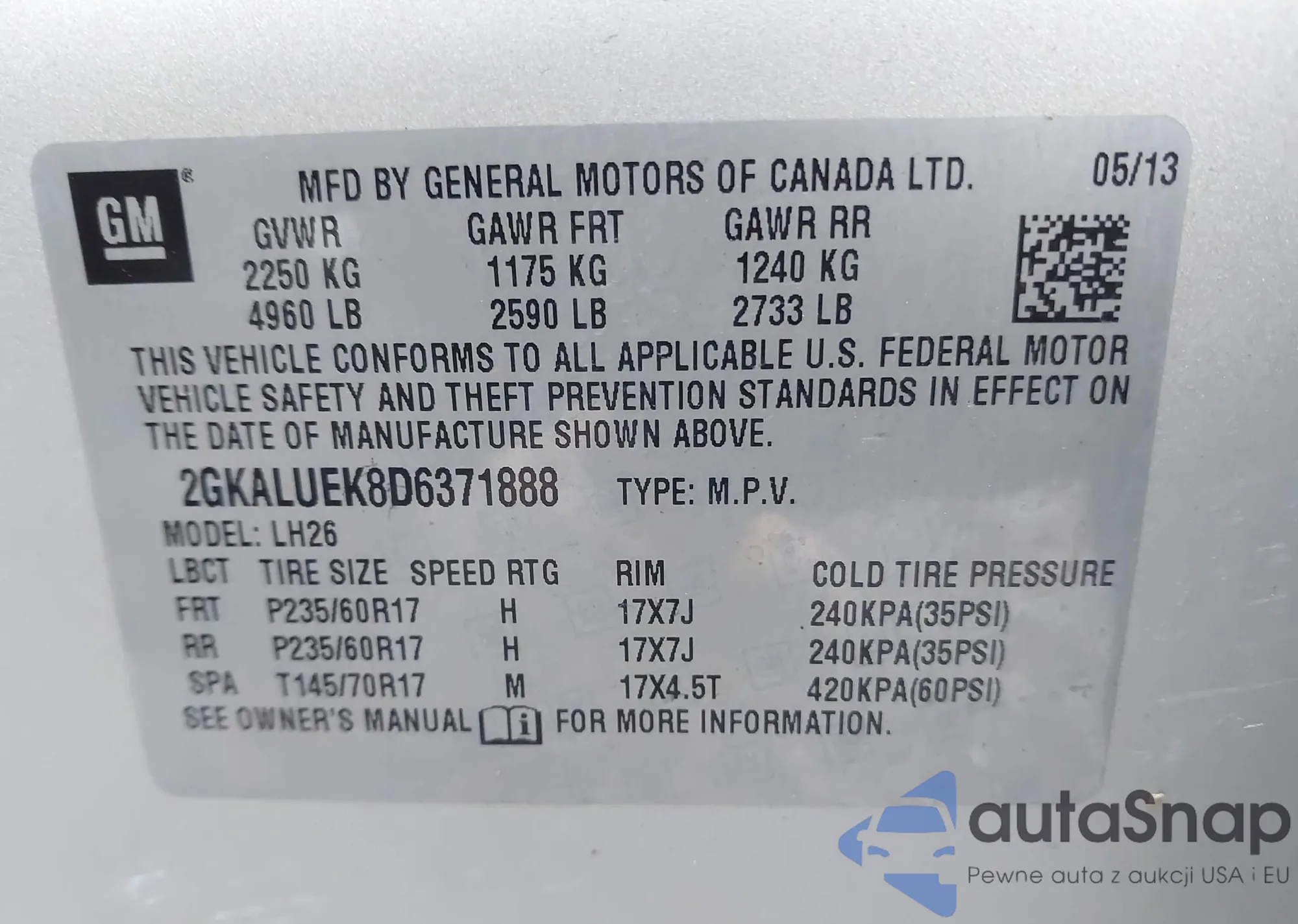 Автомобиль GMC Terrain 2013 (VIN 2GKALUEK8D6371888) ранее не участвовал в торгах. Документы чистые, пробег соответствует или ниже среднего по рынку. Продаётся страховой компанией — рекомендуем покупку. Доставка в порт займет около 6–8 недель.
