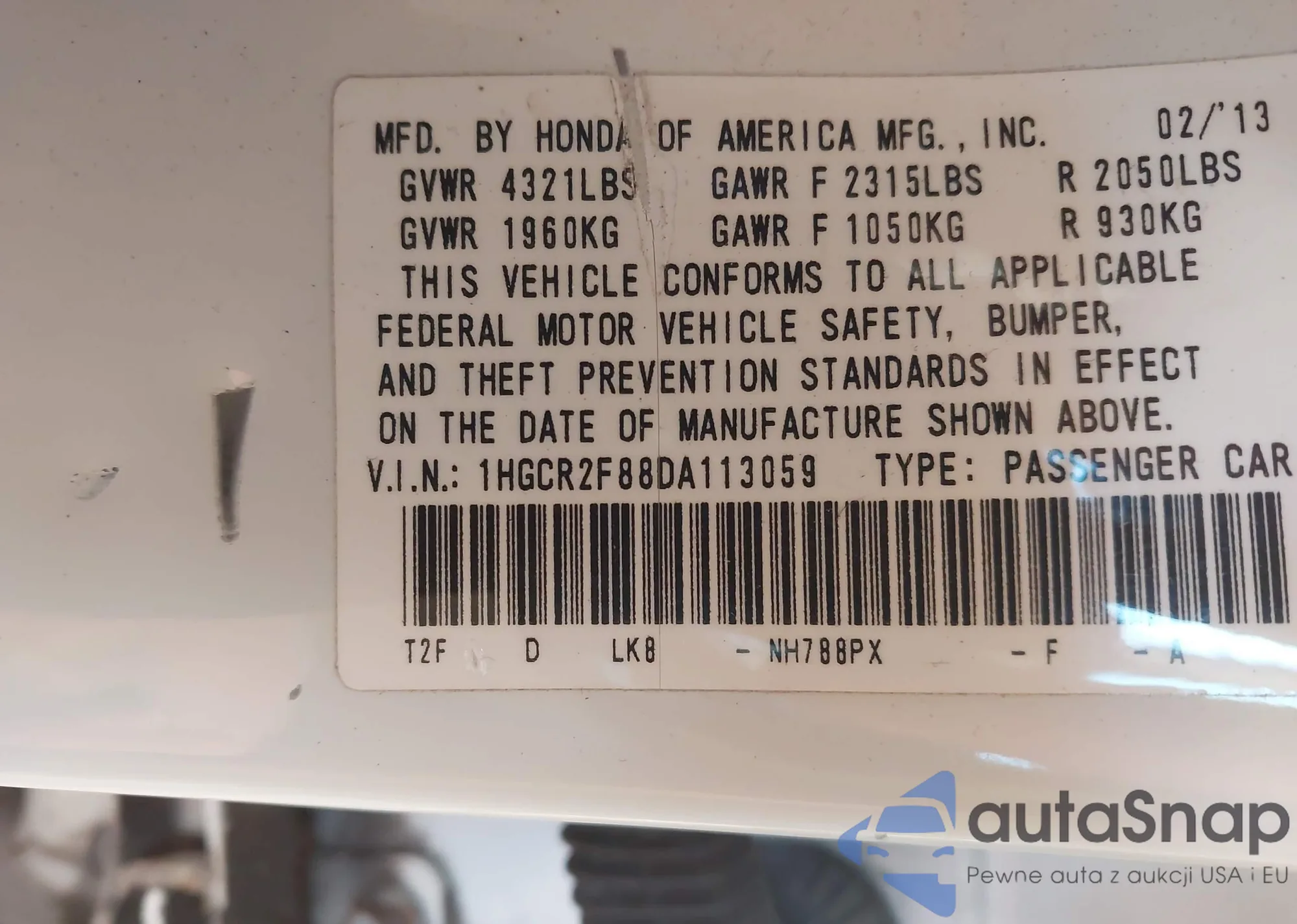 VIN: 1HGCR2F88DA113059