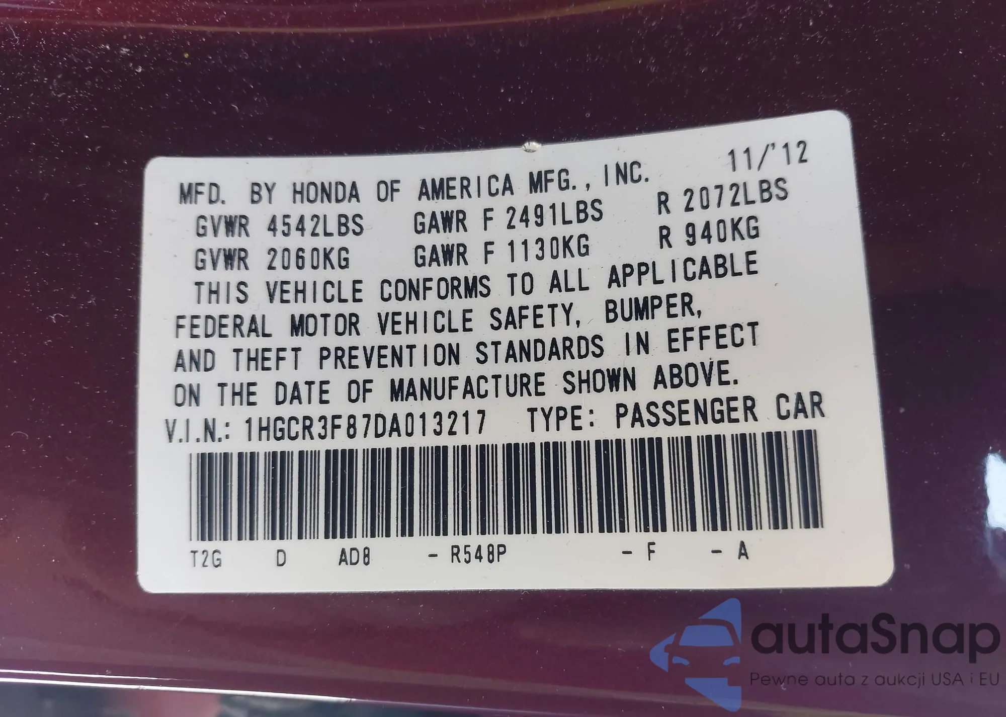 VIN: 1HGCR3F87DA013217
