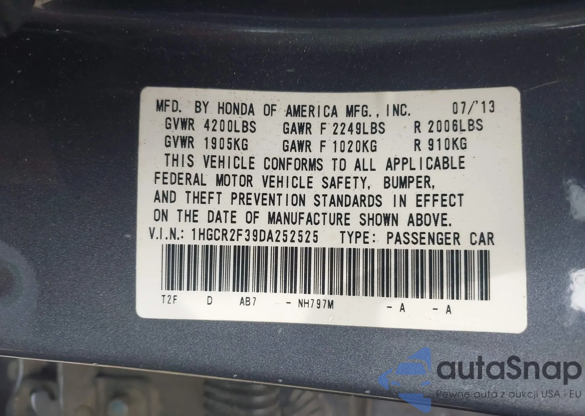 • VIN: 1HGCR2F39DA252525