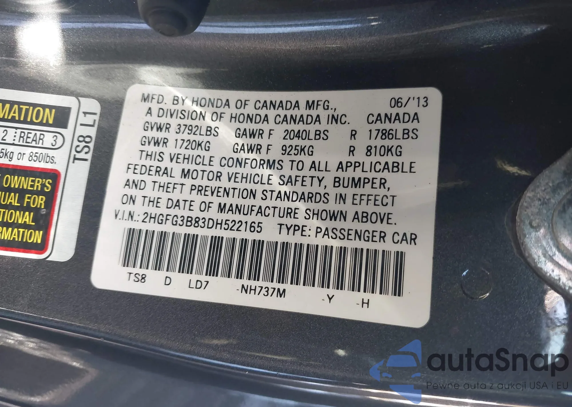 VIN: 2HGFG3B83DH522165