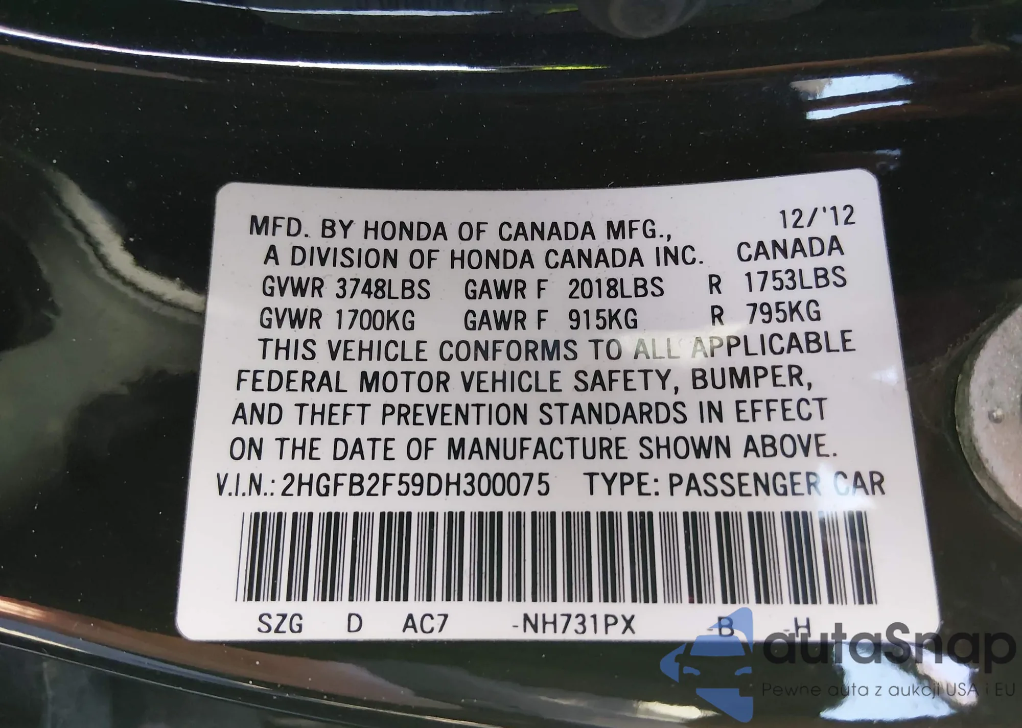 VIN: 2HGFB2F59DH300075