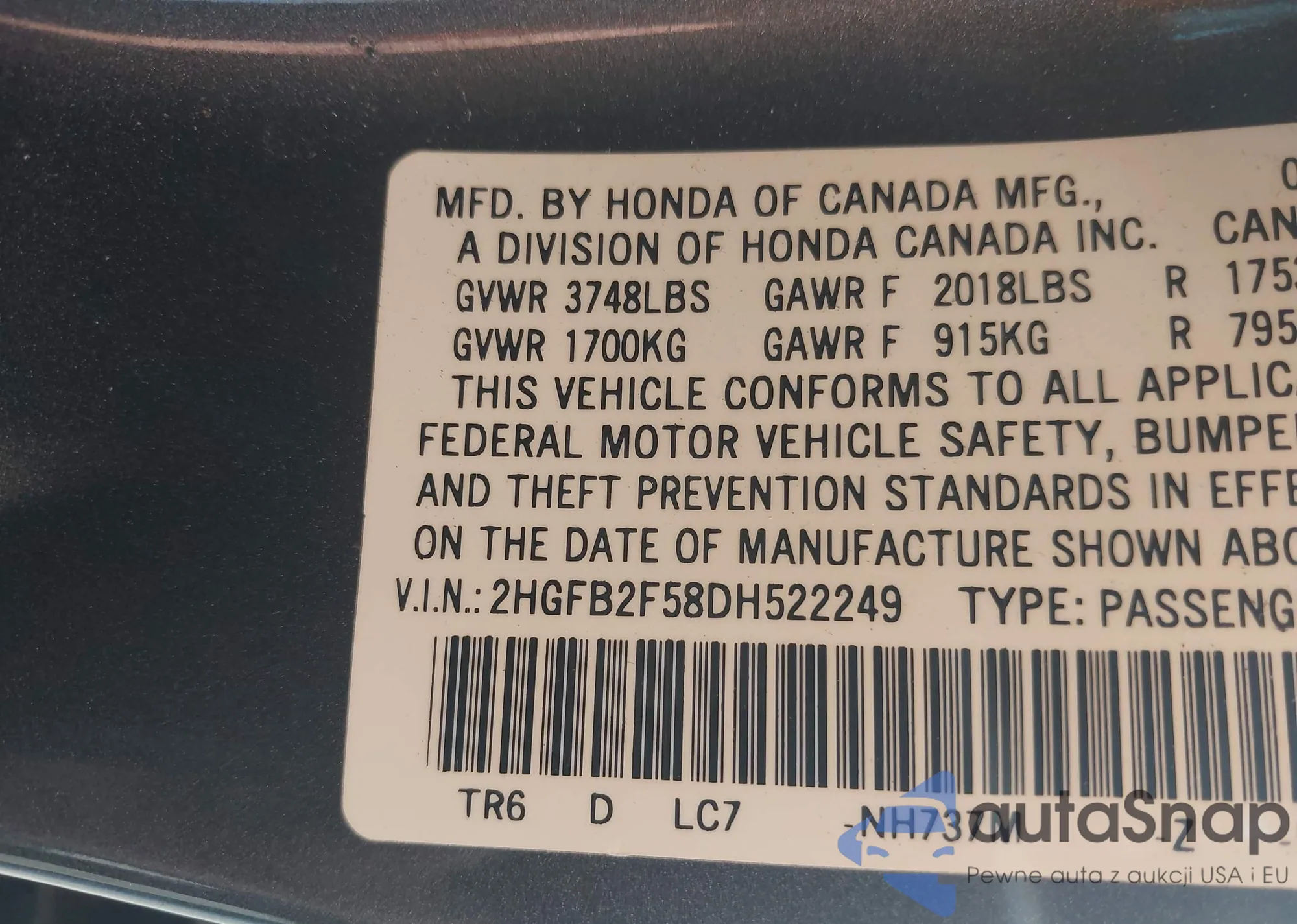 • VIN: 2HGFB2F58DH522249