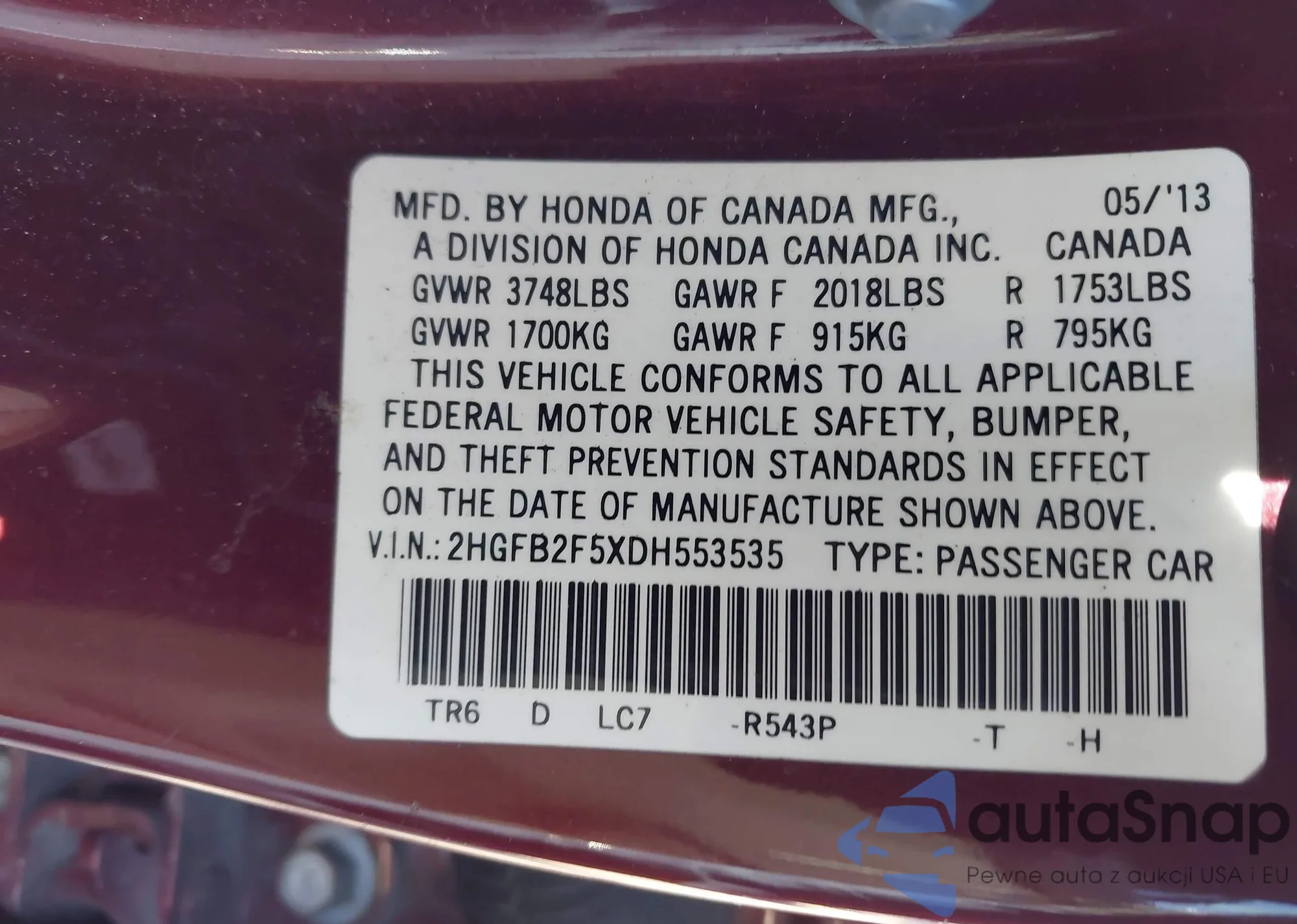 VIN: 2HGFB2F5XDH553535