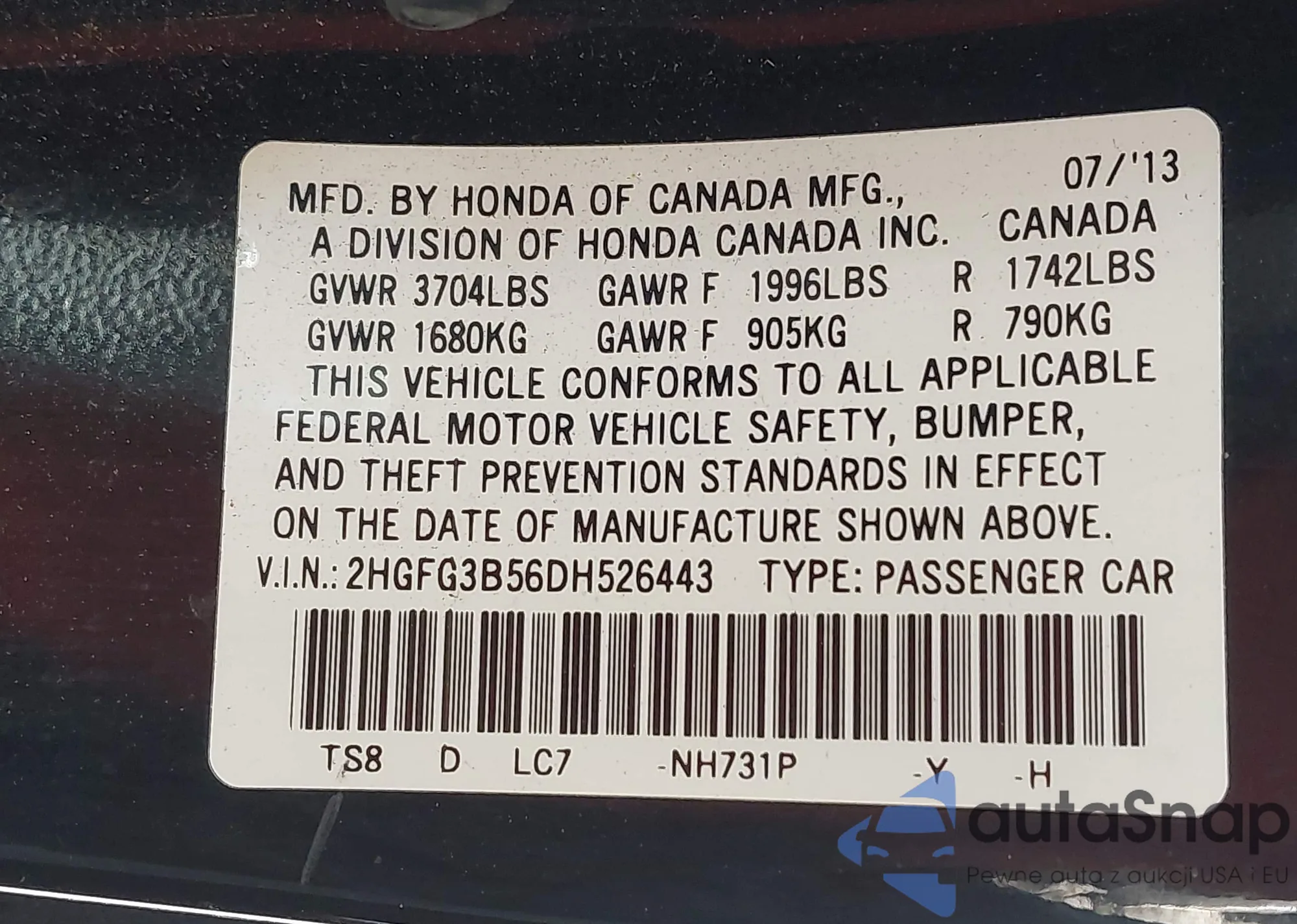 VIN: 2HGFG3B56DH526443