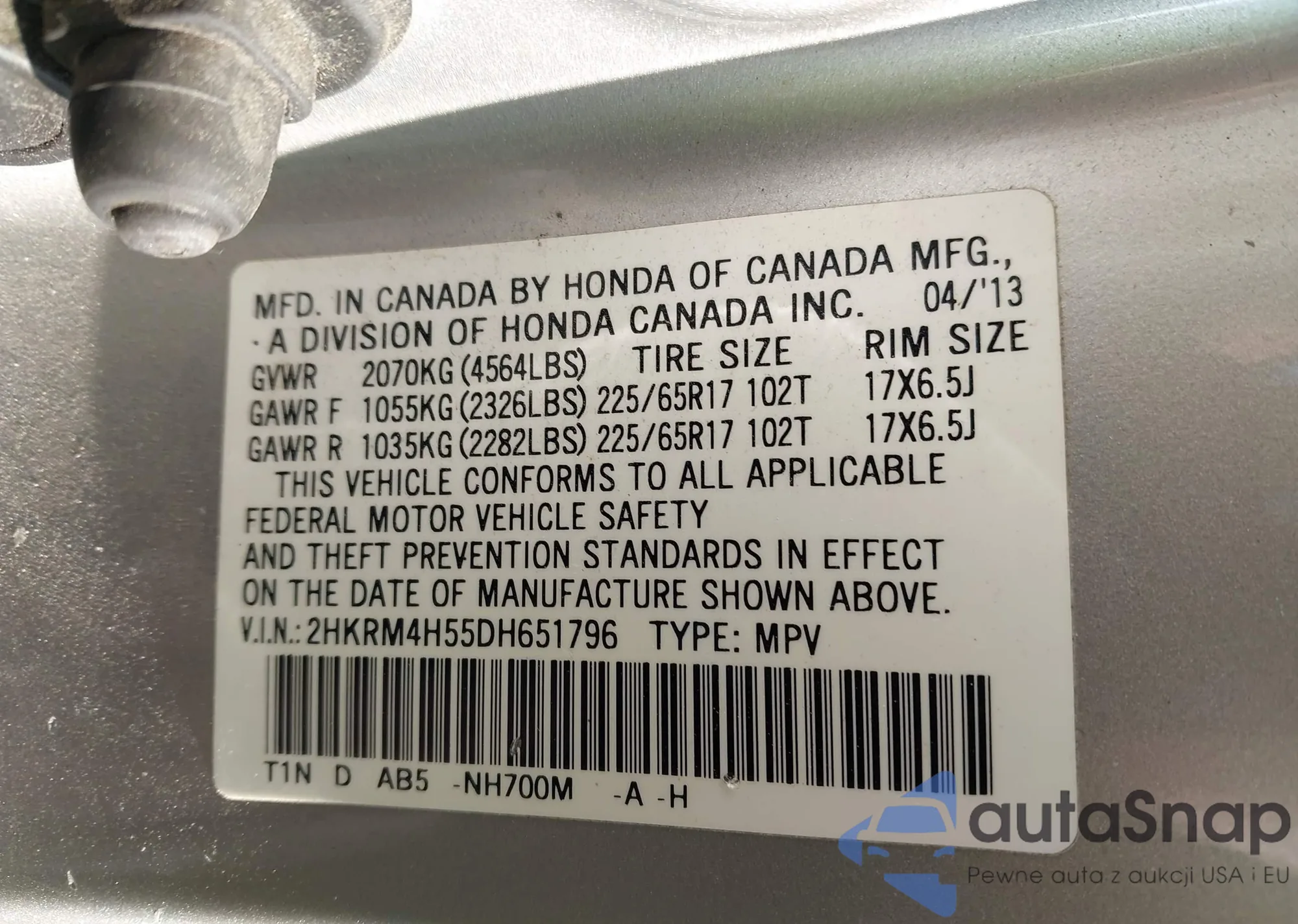 VIN: 2HKRM4H55DH651796