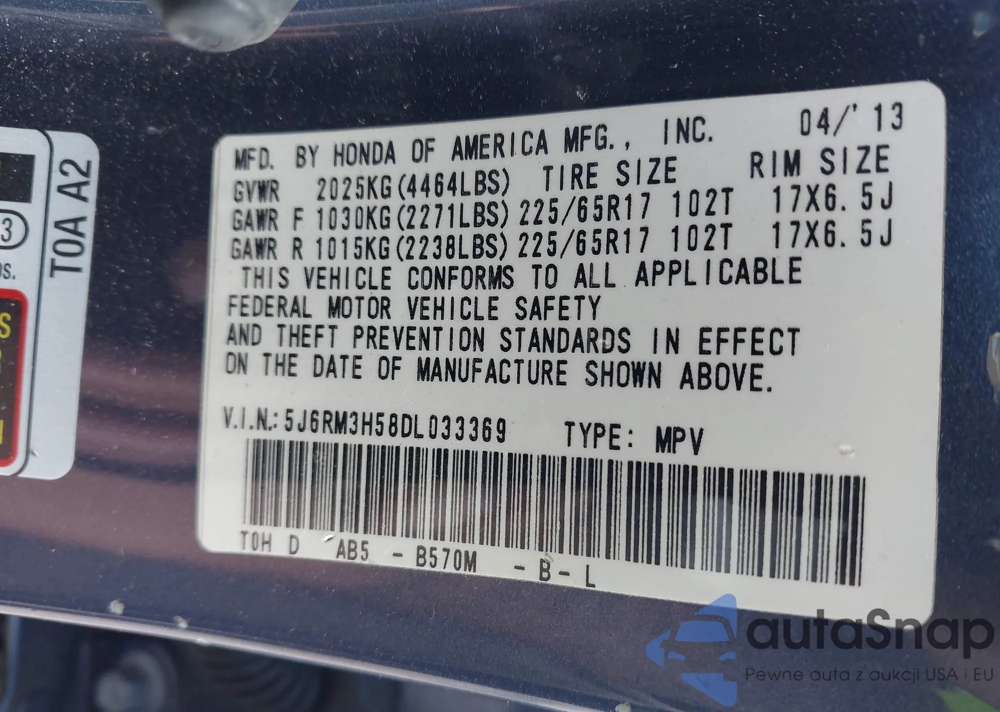 Автомобиль Honda CR-V 2013 (VIN 5J6RM3H58DL033369) имеет документы, препятствующие регистрации. Могут возникнуть сложности при экспорте и регистрации. Обратитесь к экспертам AutaSnap для поиска альтернатив.