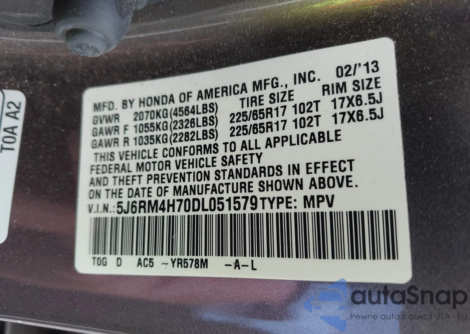 VIN: 5J6RM4H70DL051579
