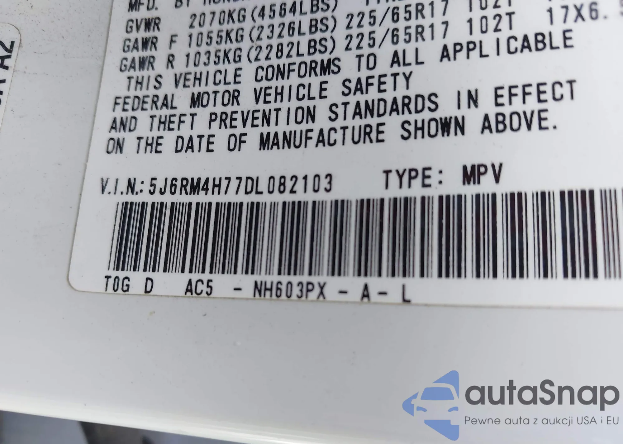VIN: 5J6RM4H77DL082103