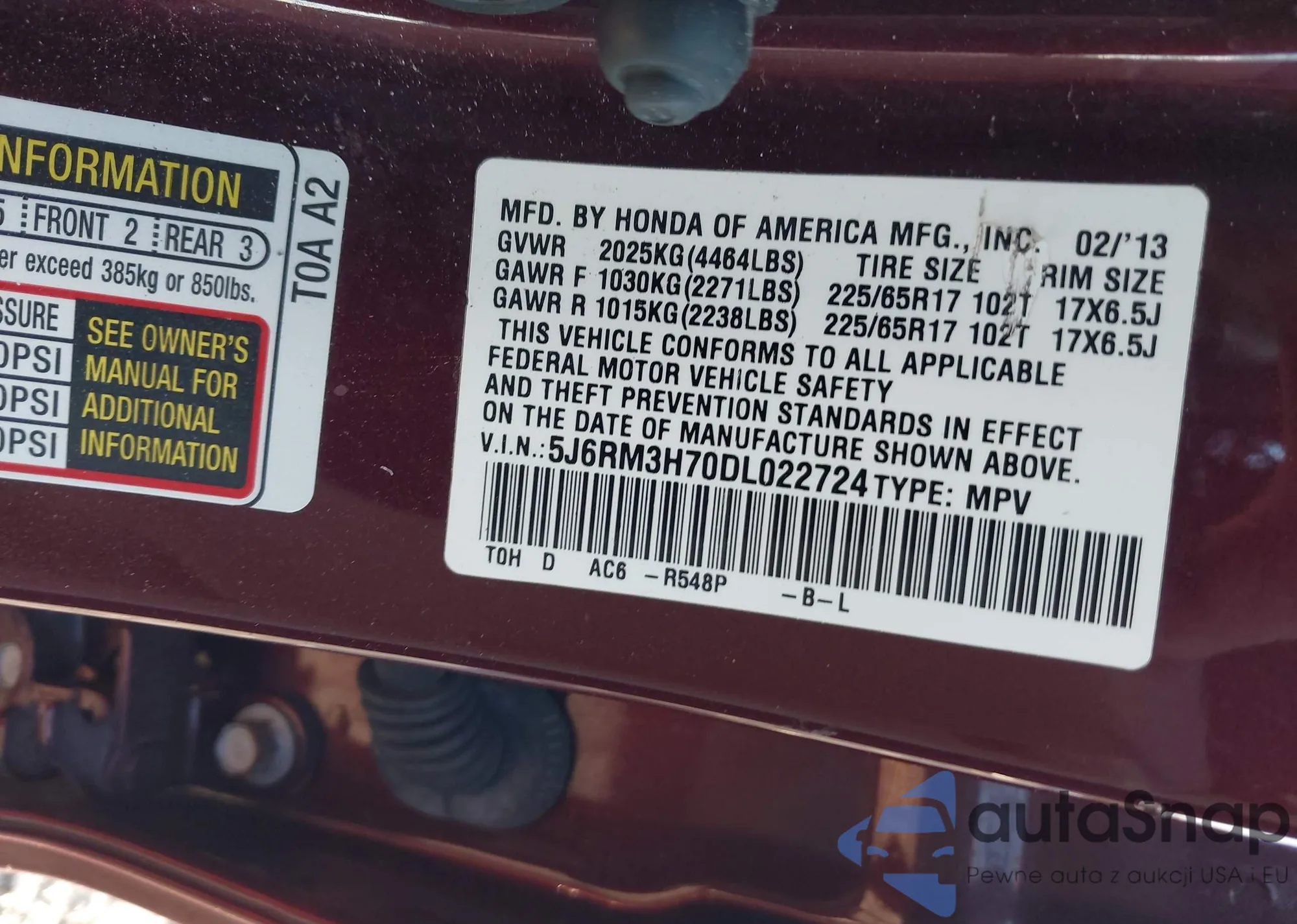 VIN: 5J6RM3H70DL022724