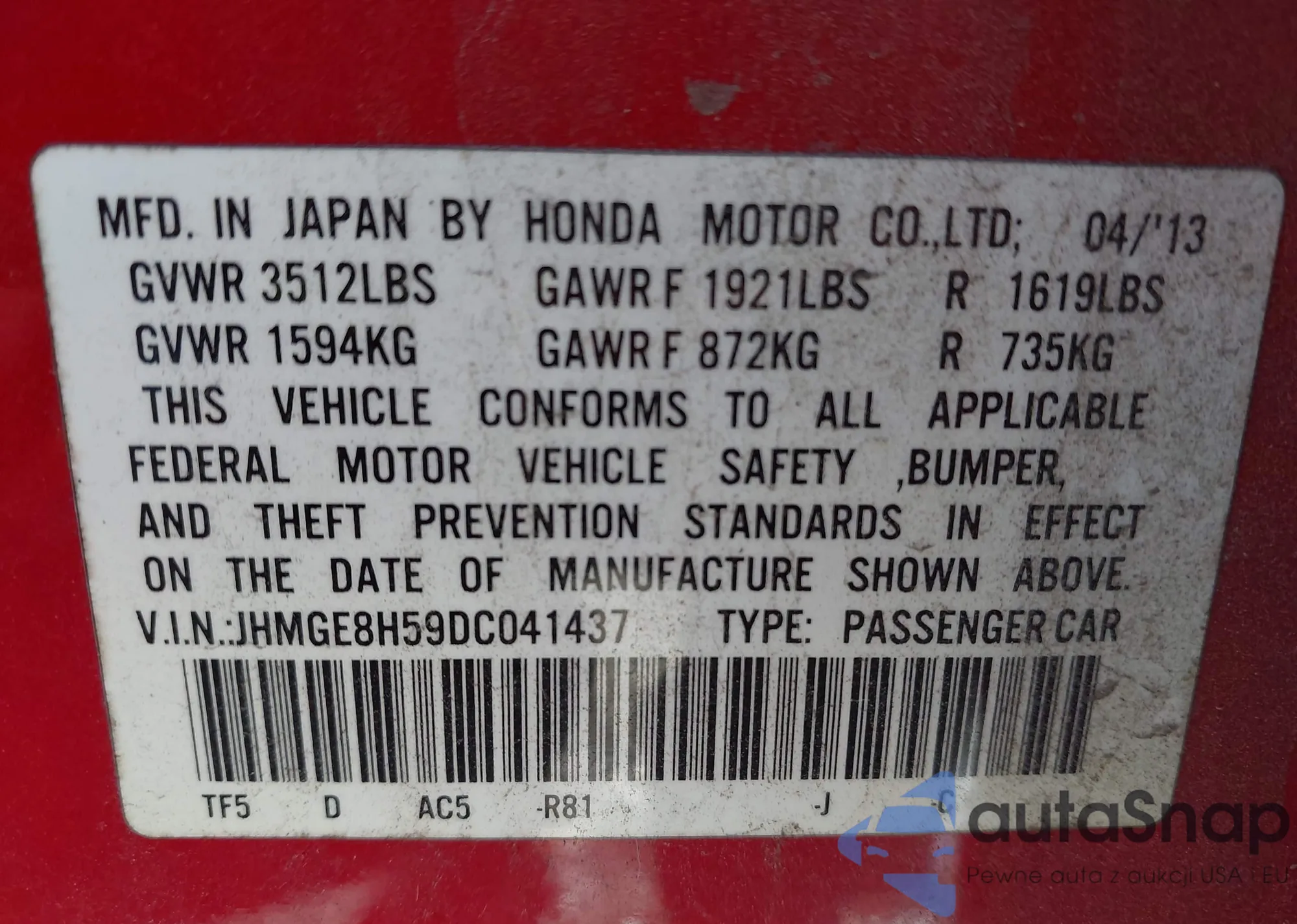 VIN: JHMGE8H59DC041437