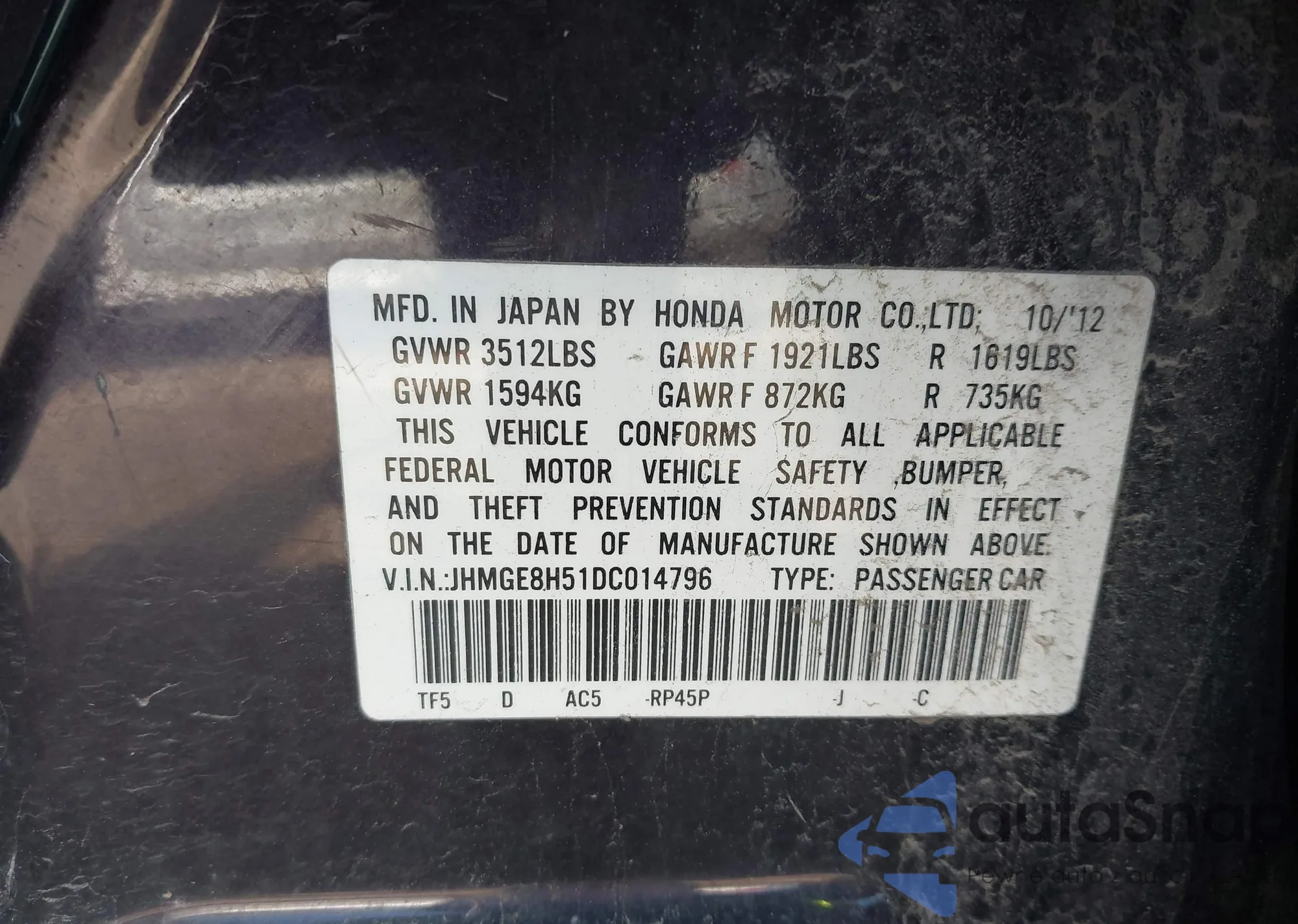 VIN: JHMGE8H51DC014796