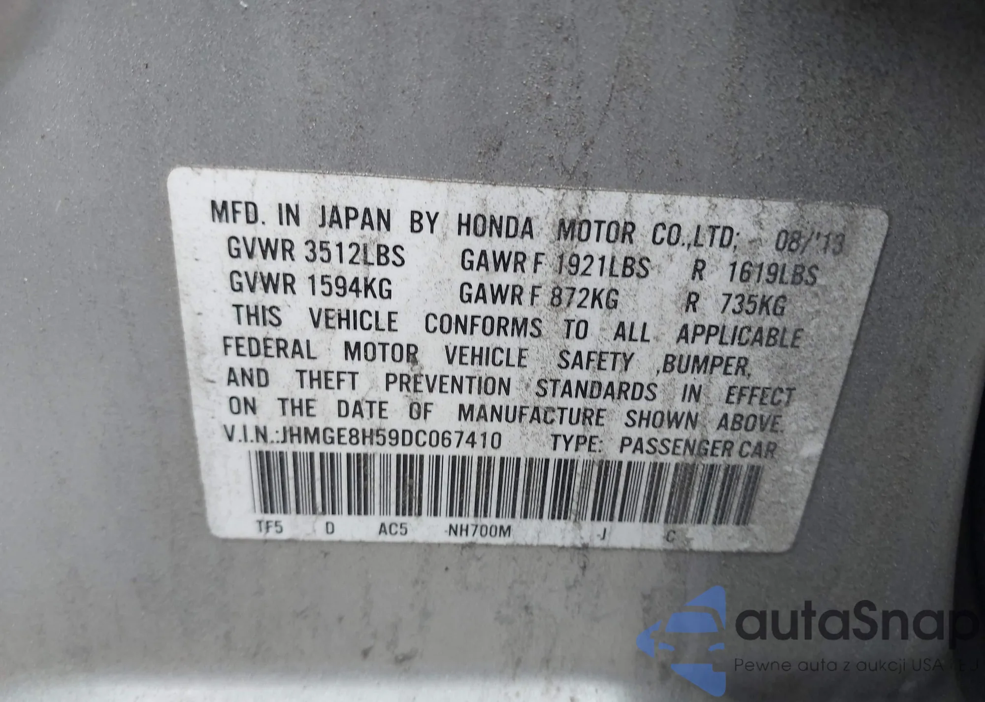 VIN: JHMGE8H59DC067410
