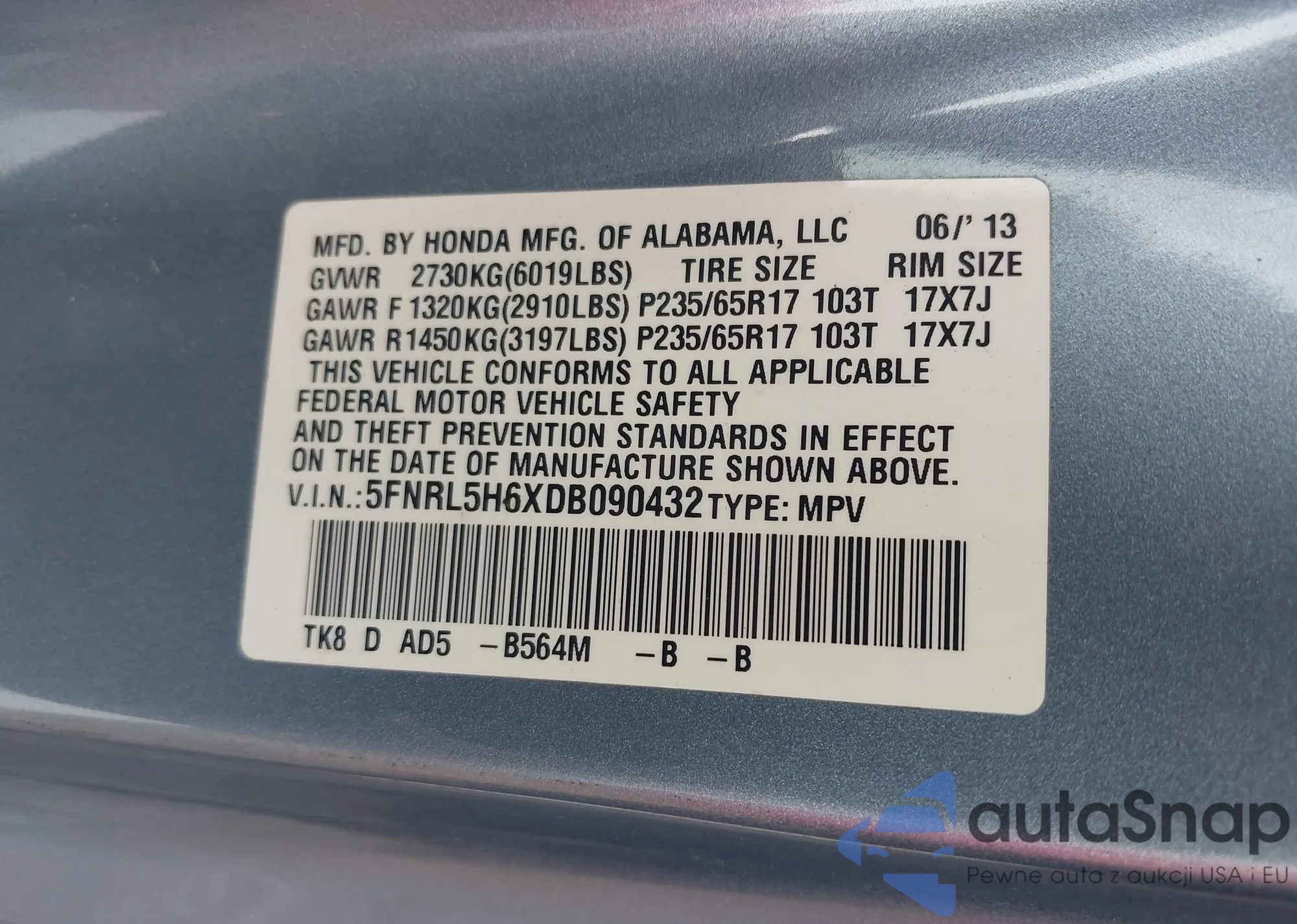 VIN: 5FNRL5H6XDB090432