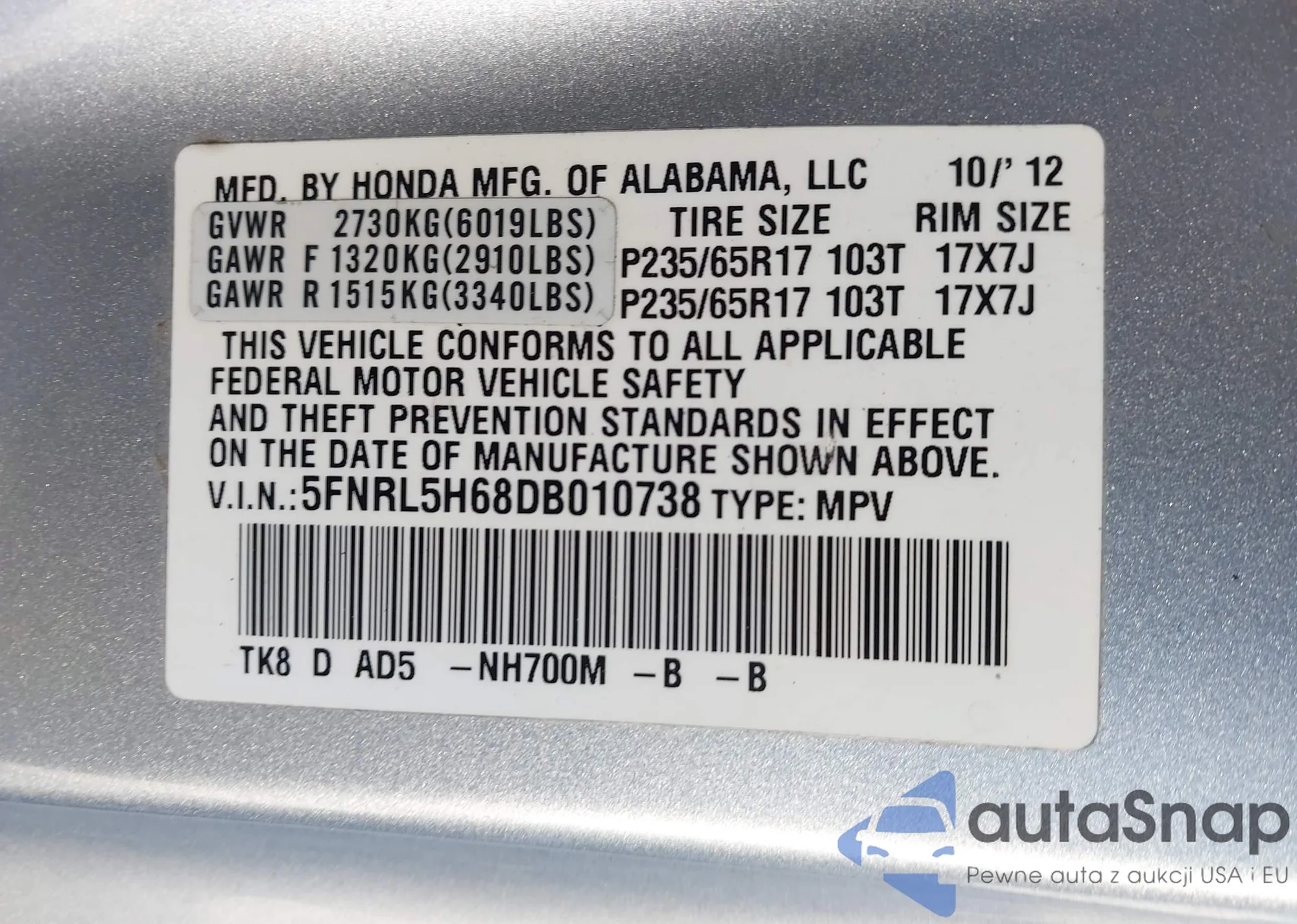 VIN: 5FNRL5H68DB010738