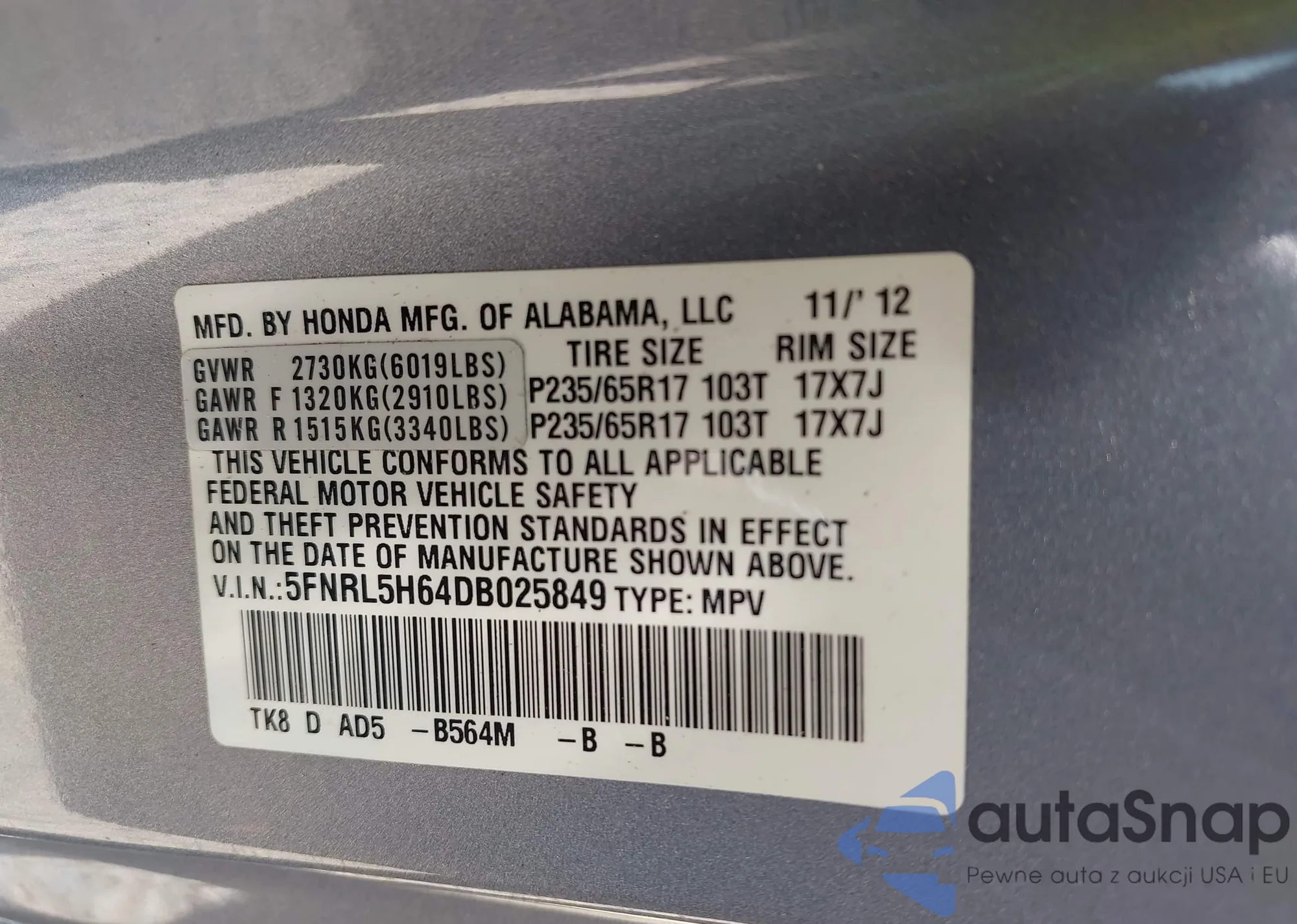VIN: 5FNRL5H64DB025849